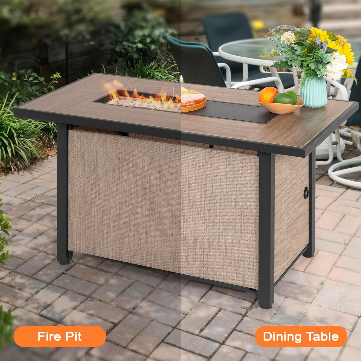 - MULTIFUNCTION FIRE PIT TABLE: This outdoor fire table with a lid does double duty as an gas firepit and patio dining table. You can stay warm while relaxing with family and friends around a propane fire pit, and a gas fire pit is the perfect complement for social gatherings