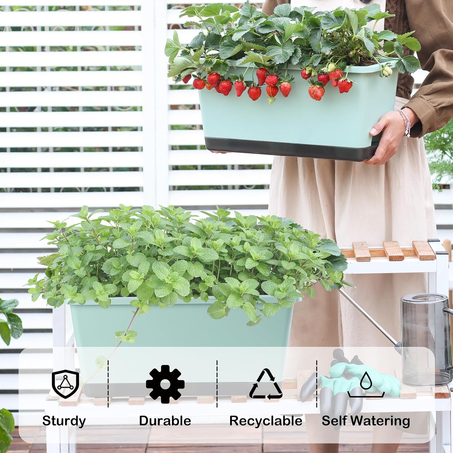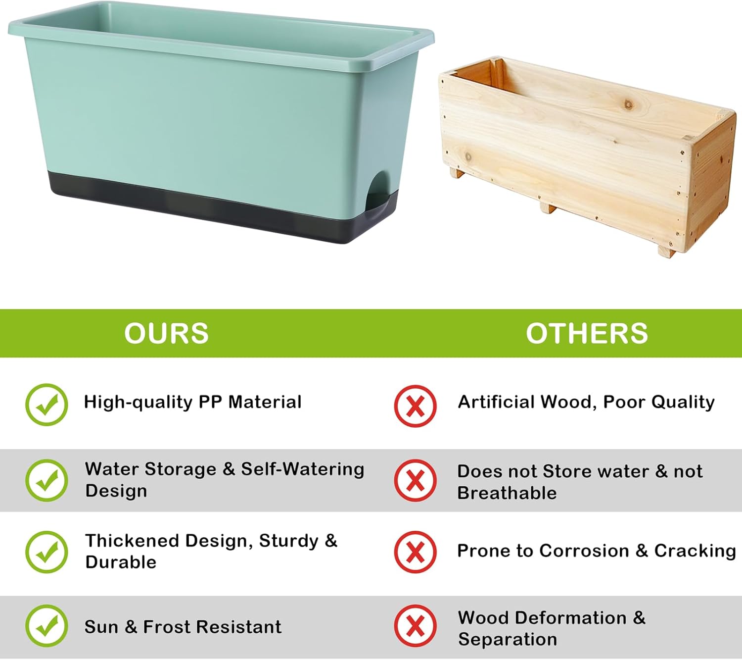 - 【Premium & Durable】The planter pots are made of high quality PP material and has been thickened to bear up to 300KG (660LB). This window box planter is sturdy, wear-resistant and durable. It can be exposed to light, wind, and sunlight for long periods of time, with a lifespan of decades. It is an excellent planter box for both indoor and outdoor.