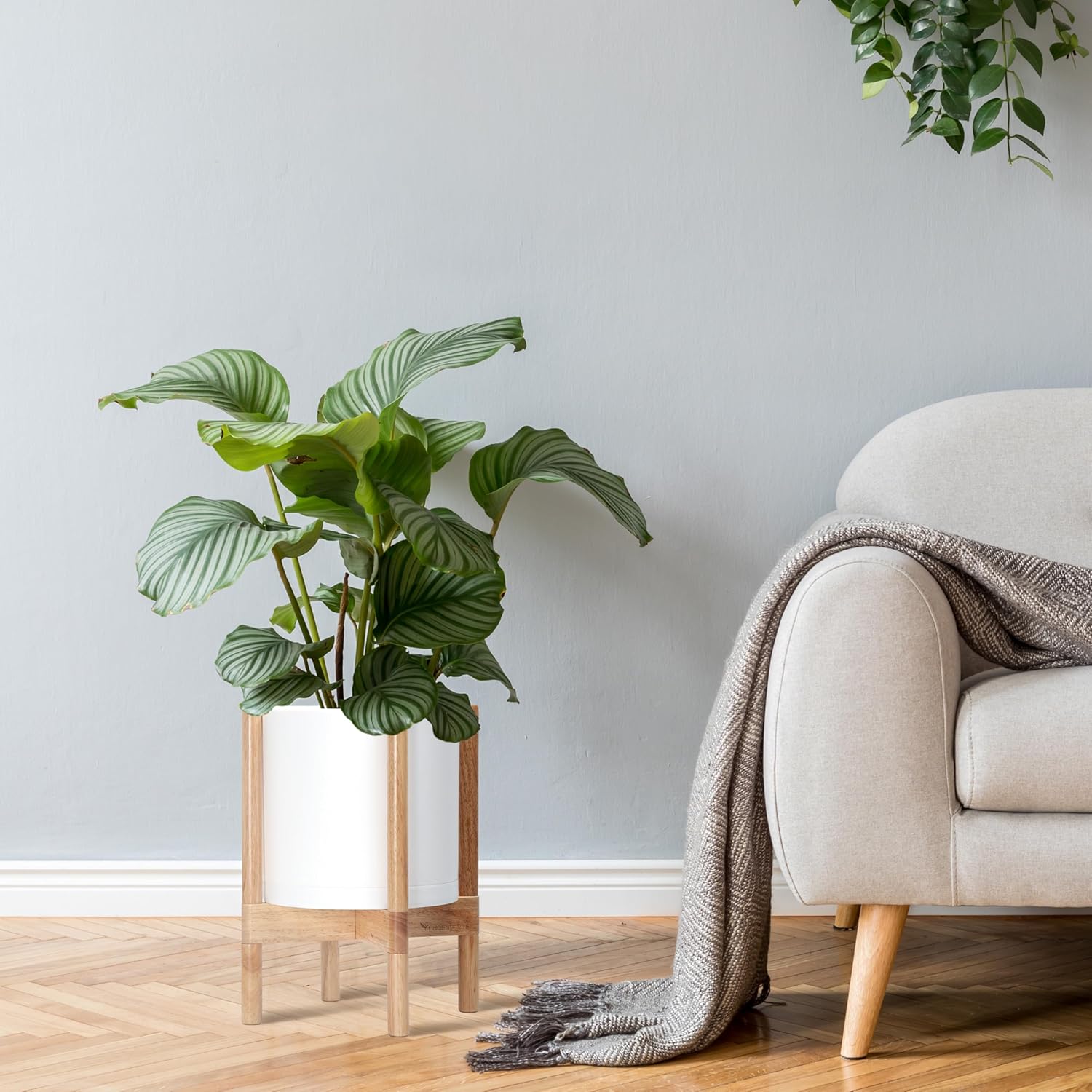 - A Complete Set: Minimalist plastic planter, combined with a sculptural, solid wood stand that match perfectly together and looks great in any home.