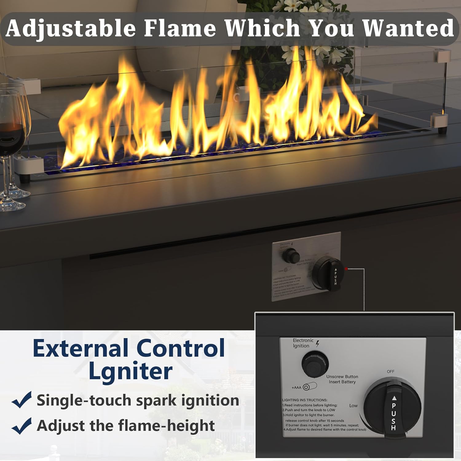 - Glass Windshield: Ignite a warm, inviting flame over the sparkling glass rocks and watch it burn all night, as an included glass wind guard adds elegant appeal while keeping the fire going even during a breeze. The Outdoor Rattan Fire Pits Table provides heat to whoever is around your fire table, we wonβt leave you out in the cold