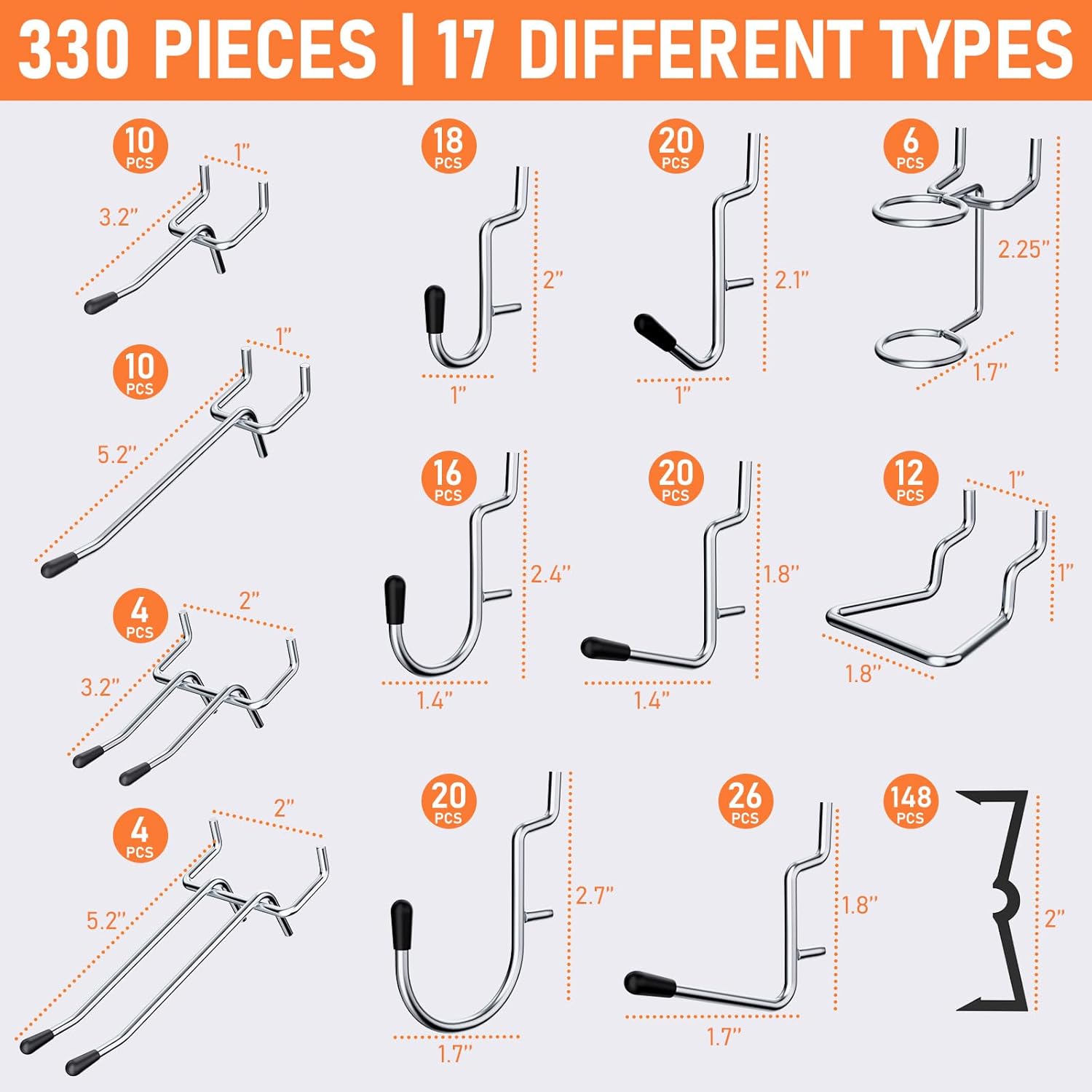 - VALUABLE PACKAGE: The upgrade pegboard hooks set comes with 330 pieces peg board accessories in 17 different types, including: 9 x pegboard bins, 3 x pegboard cups, and various hooks like curved hooks, angled hooks, straight hooks, pliers holder, ring tool holder, multi tool rack and peg locks for fix hooks