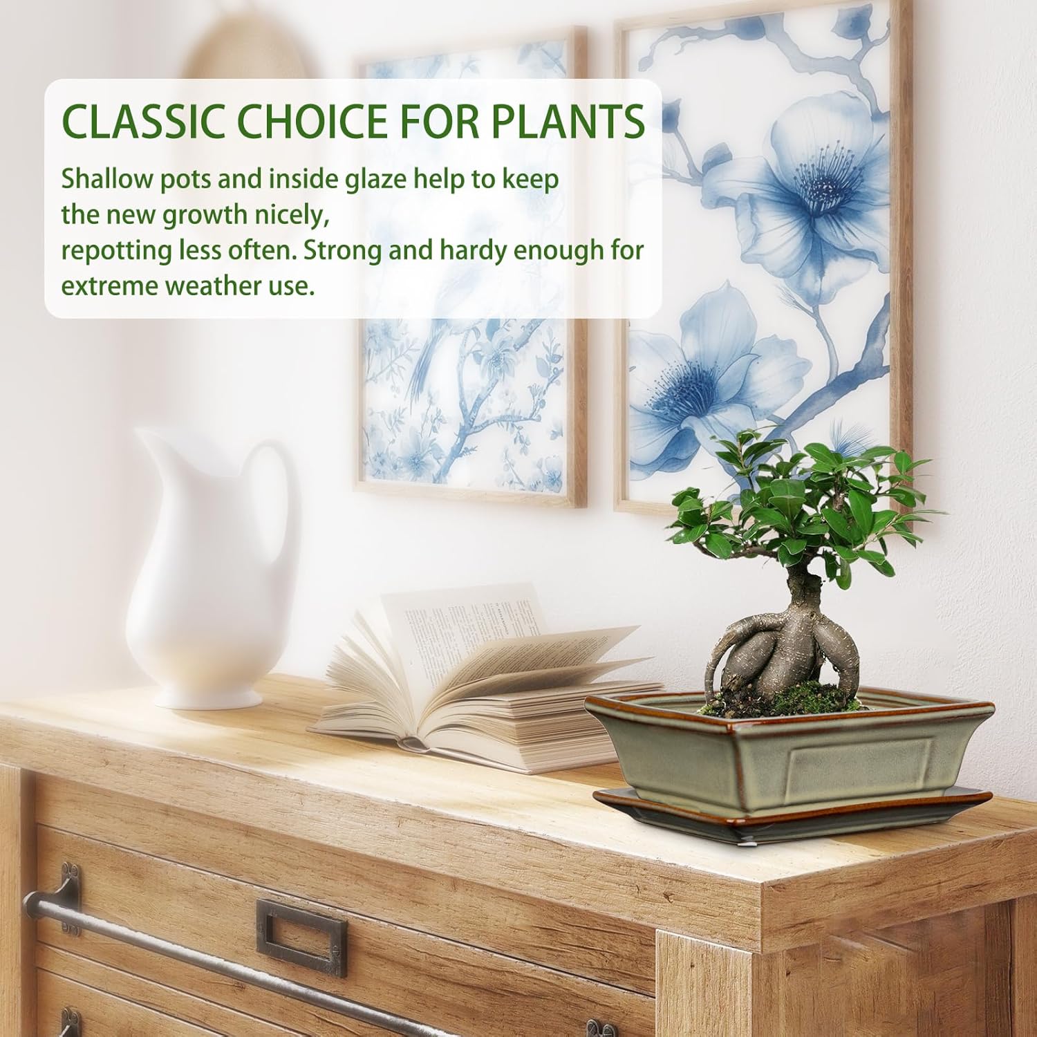 - Versatile Narrow Rectangular Design. Designed for flexible placement, these shallow bonsai pots planters fit seamlessly on windowsills, desks, shelves, or coffee tables indoors, or in sunny garden and patio spots outdoors. The compact shape of ceramic bonsai pots is ideal for bonsai training or sun-loving plants. Finally, a rectangular bonsai pot planter that adapts to your life—whether you're curating a cozy reading nook or a sunny patio oasis.