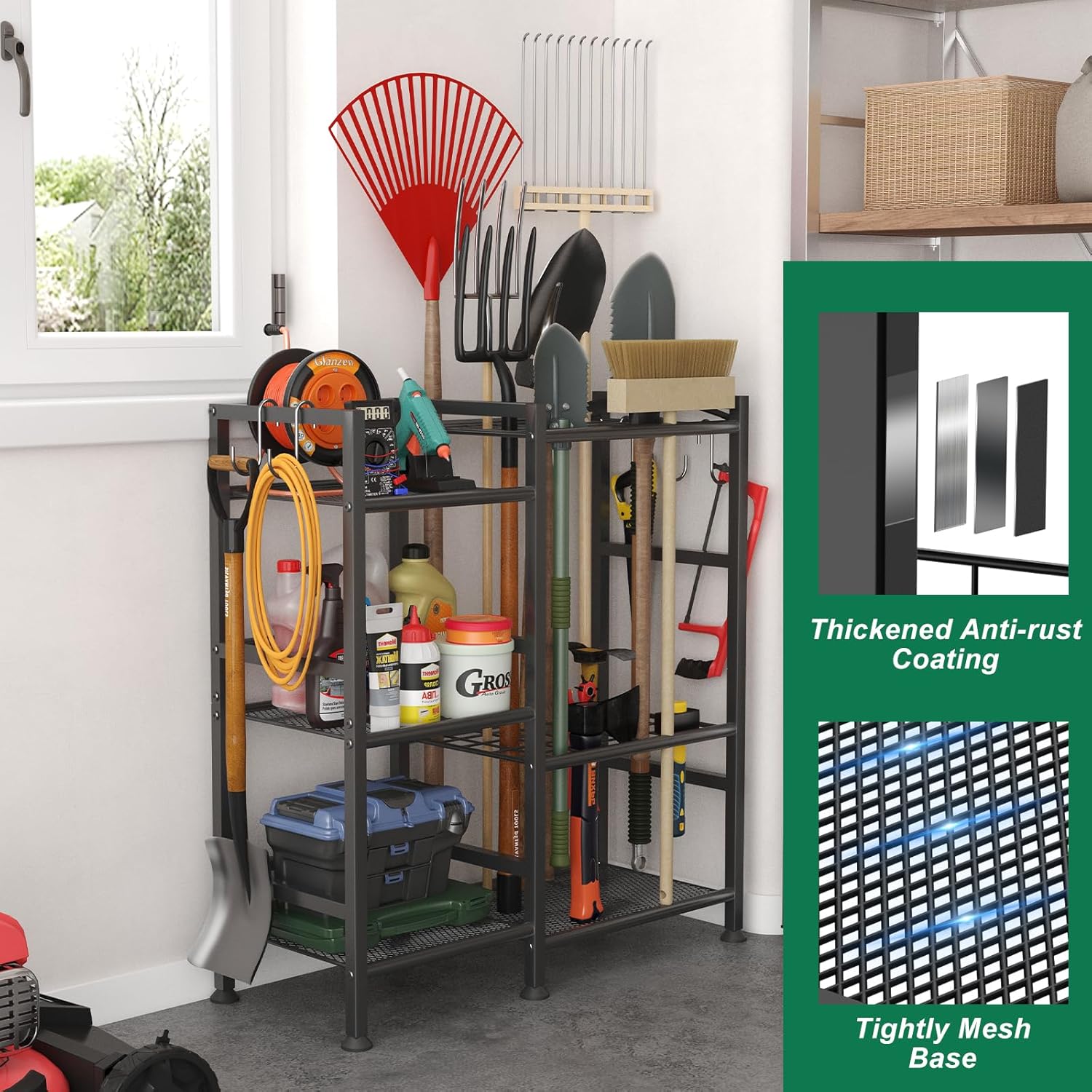 - 【Up to 35 Long-Handled Tools】The three-tier design of the tool rack has 35 slots of different sizes for long-handled tools; it also comes with 5 large removable hooks. The tool rack is equipped with 4 leveling feet for use on uneven surfaces.