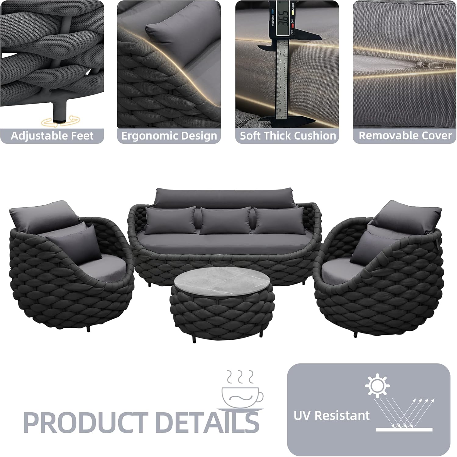 - Soft & Comfortable: Outdoor patio furniture has 3.7" thick seat cushions that are upholstered by water-resistant and UV-protective polyester fabric for ergonomic optimal comfort.Cover of cushions can be removeable and washable by invisible zipper as well
