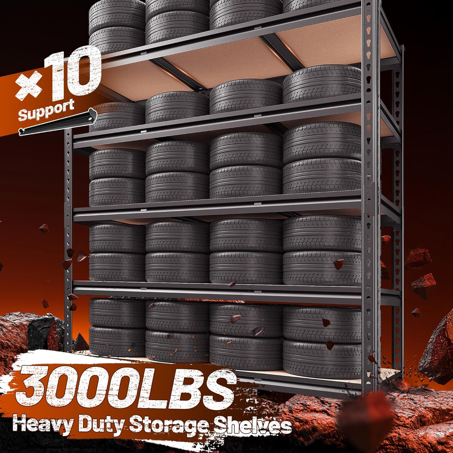 - ă3000LBS Capacity Heavy Duty Garage Shelving with 10 Big Ribs BeneathăREIBII Garage storage shelves adopts rolled edge thickened columns, each metal shelving with 10 big reinforcing ribs. Each layer can withstand a weight of 600 pounds, with a total bearing capacity of 3000 pounds. Such strong load-bearing capacity and high-quality metal materials makes 5-tier garage shelving unit more stable, solid and more stuff can be stored