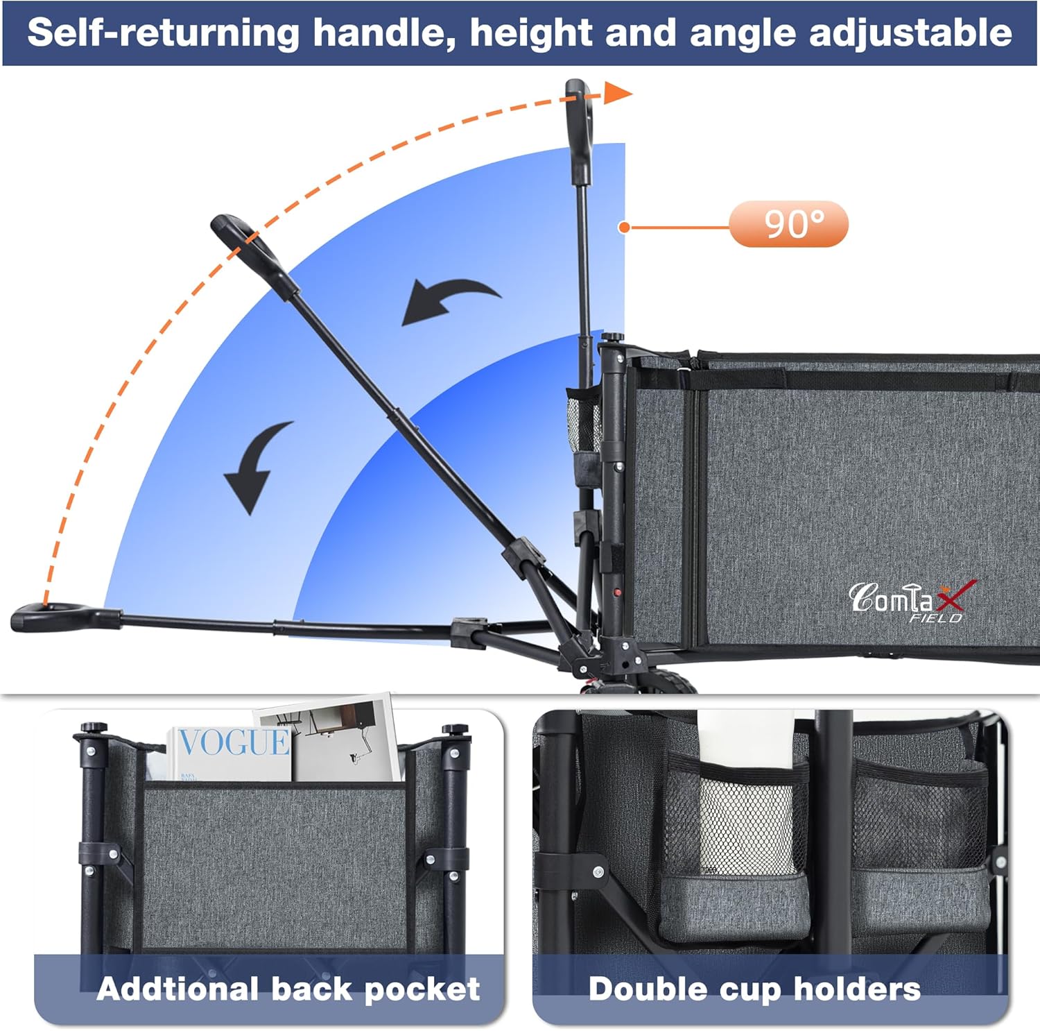 - Automatic Rebound Handle: The handle is adjustable in both height and angle for personalized comfort, and it automatically rebounds to stay upright for safety. This collapsible wagon cart also comes with two cup holders and a side pocket for extra storage