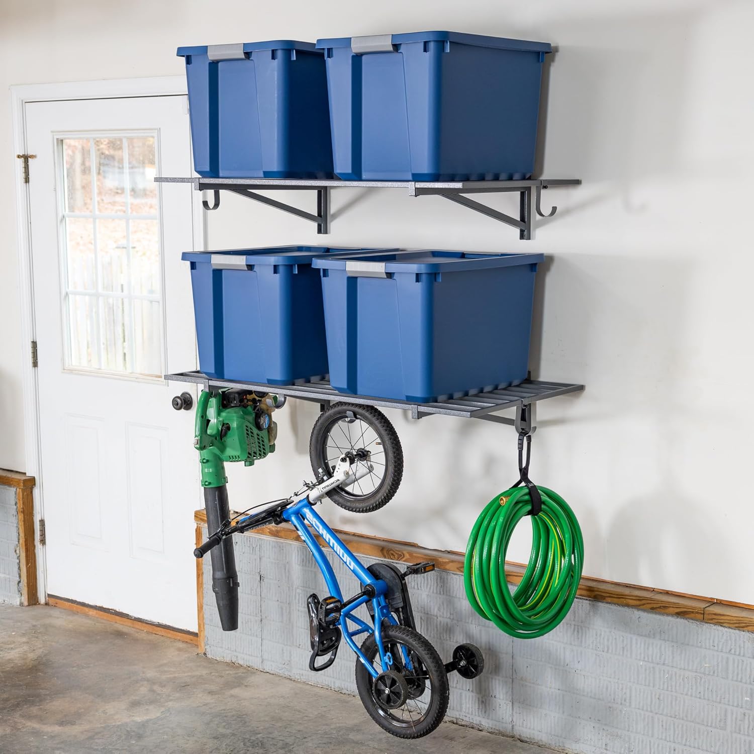 - INCLUDES STORAGE HOOKS – Comes with 2 large and 4 small garage hooks for added hanging storage under each wire shelf. Use the hooks for cords, garden tools, bags, or garage wall organizer systems. Maximize vertical space while keeping frequently used tools within reach.