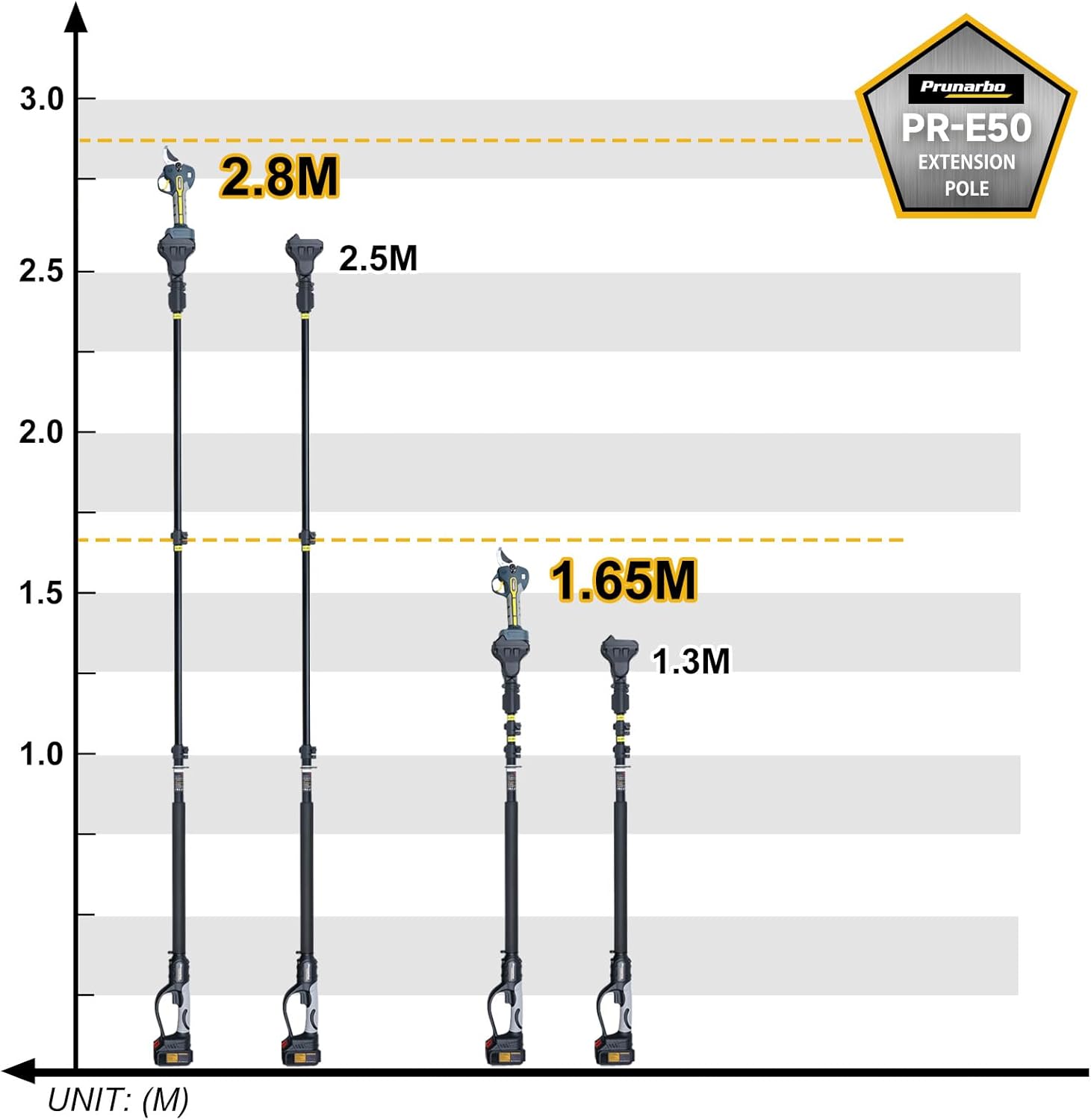 - 【Versatile Application】This pole is perfectly compatible with electric pruning shears PR-E30 、PR-E40、PR-E50 and chainsaw PR-E8. (These pruner machines are Not included. You can buy them according your needs.) Effortlessly trim high branches or prune low large branches, vegetables, weeds, and more, even in dense, thorny shrubs or narrow spaces.