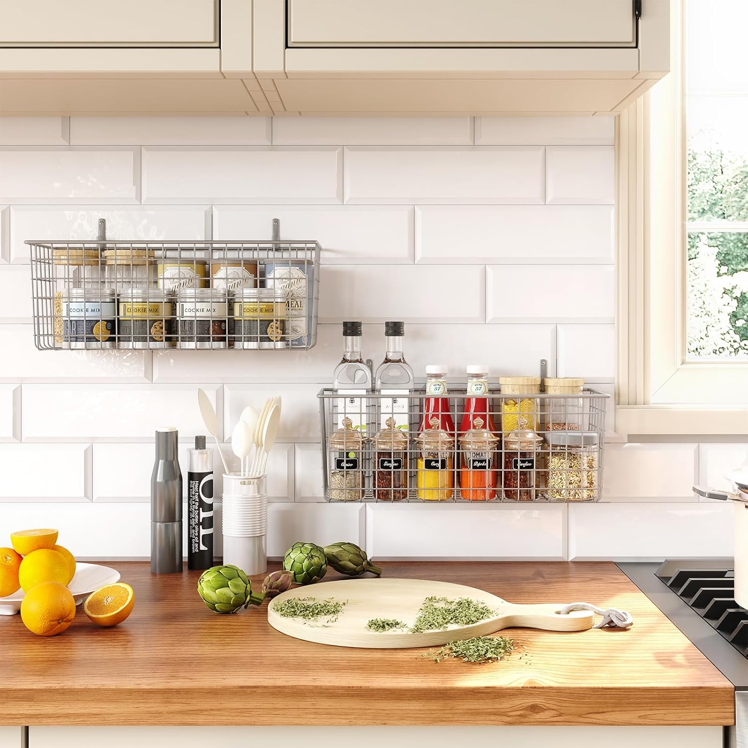 - Neat and Space Saving Organizer: They are ideal wall mounted storage baskets for home decor clearance, pantry, kitchen, cabinet, door, bathroom, bedroom, laundry,, closet, craft rooms, garage, office , farmhouse and more. You can also put it on sink, counter and other table tops. Make your storage double as dรฉcor for a streamlined and organized home.