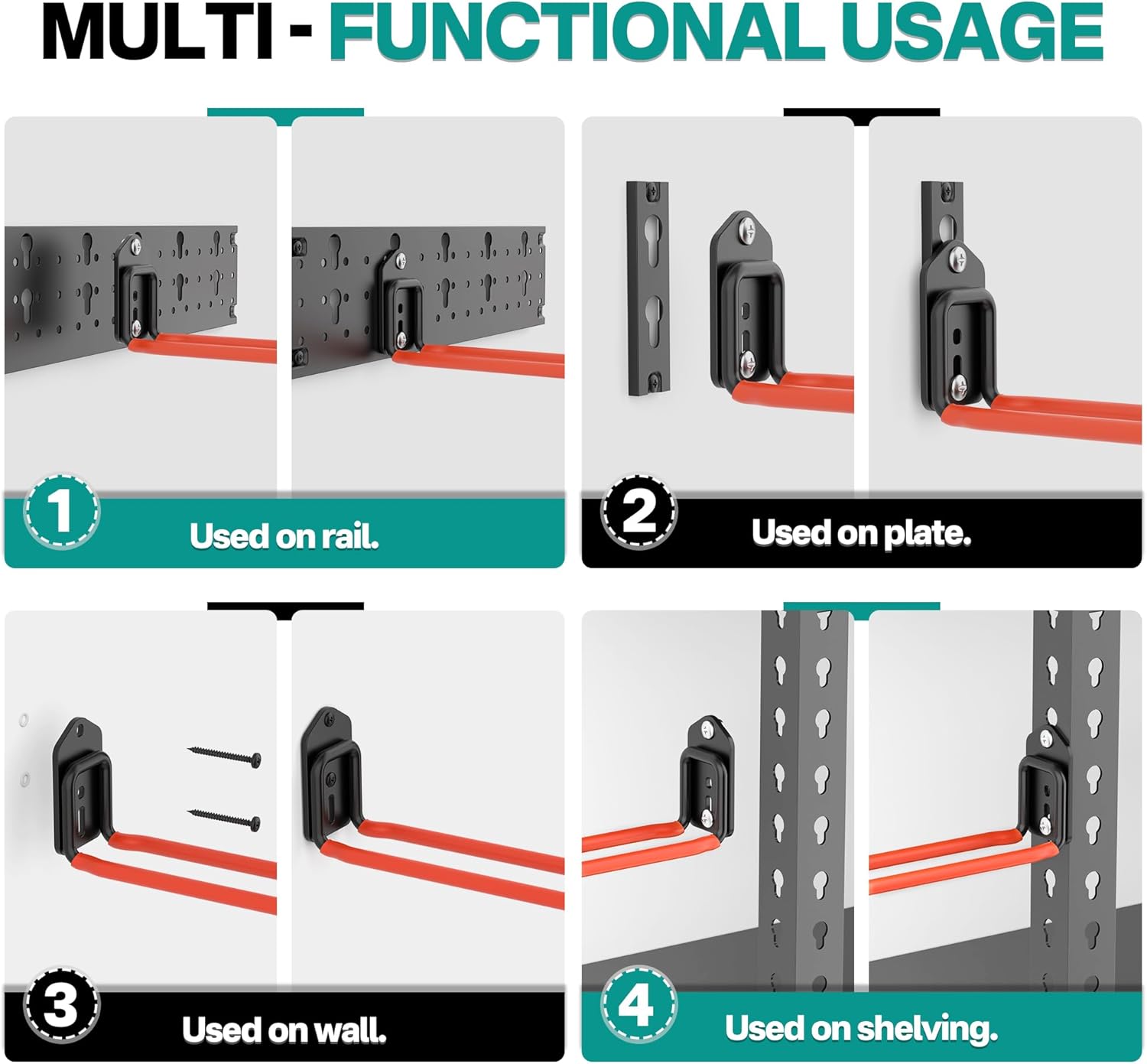 - Versatile Storage Options: Comes with 8 adjustable hooks, 3*16 inches rails, and 4 mini bases. You can customize the hook layout by locking them to the rail or base, mounting them directly to the wall, or placing them on shelves to suit your storage needs