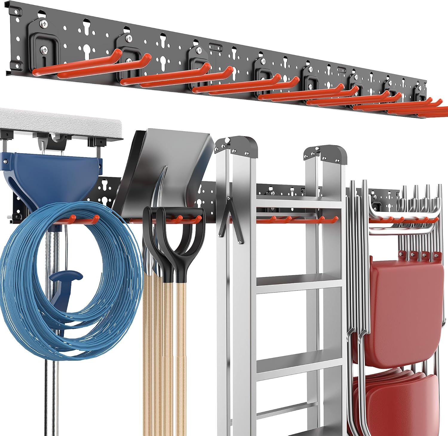 EVERHANGER Garage Tool Storage Organizer Wall Mount, Versatile Garden Tool Rack Organization, Folding Chair Hangers with 8 Multifunctional Hooks, Max Load 330lb, 48inch