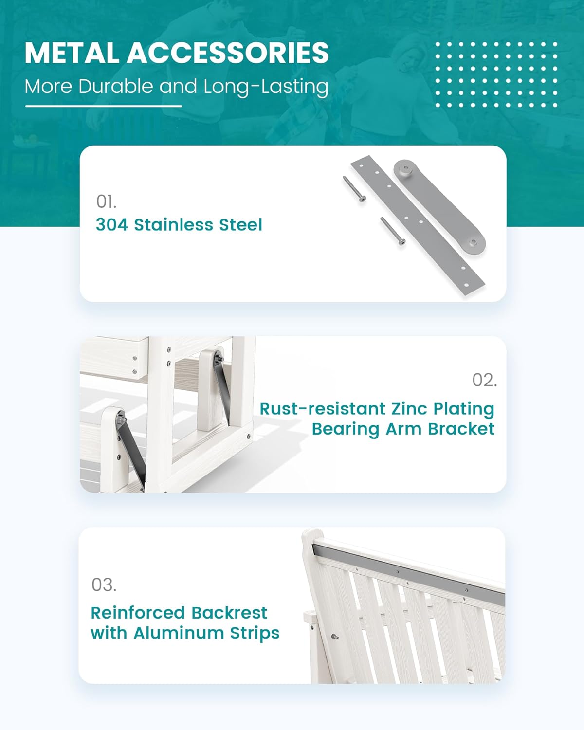 SERWALL 2 Person Patio Glider Rocking Chair, HDPE Material Weather-Resistant Swinging Bench for Outdoor Porch Garden, White