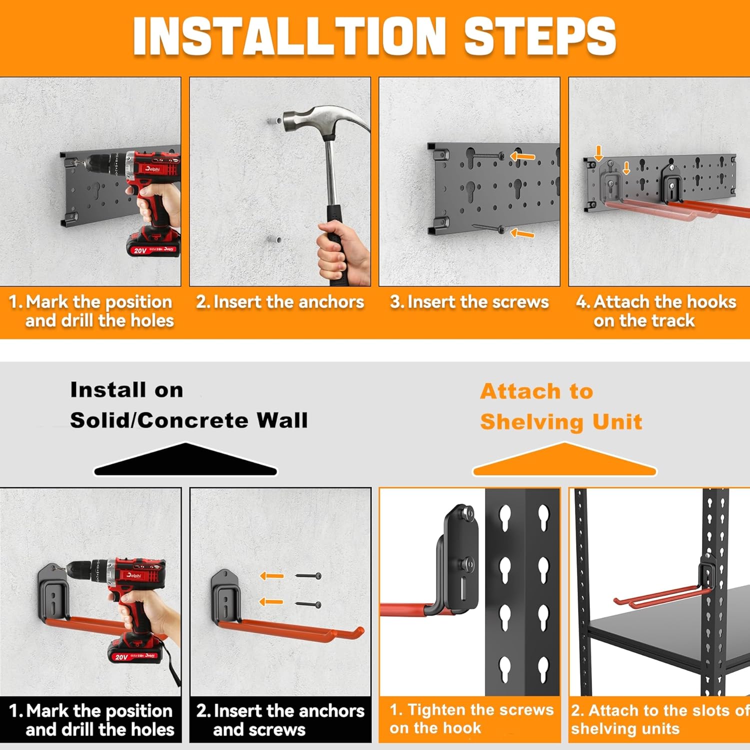 - Customizable and Easy Installation: Our tools rack includes 4 separate tracks and 4 mini plates, allowing you to arrange them to fit your garage space. Installation is simple with pre-aligned holes for easy mounting on 16" studs