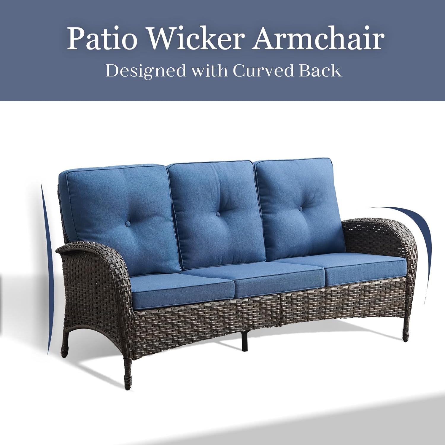 HUMMUH Outdoor Patio Couch-Outdoor Rattan Couch with Thick Cushions Outdoor Sofa for Deck Lawn Porch Balcony Poolside-Brown/Blue