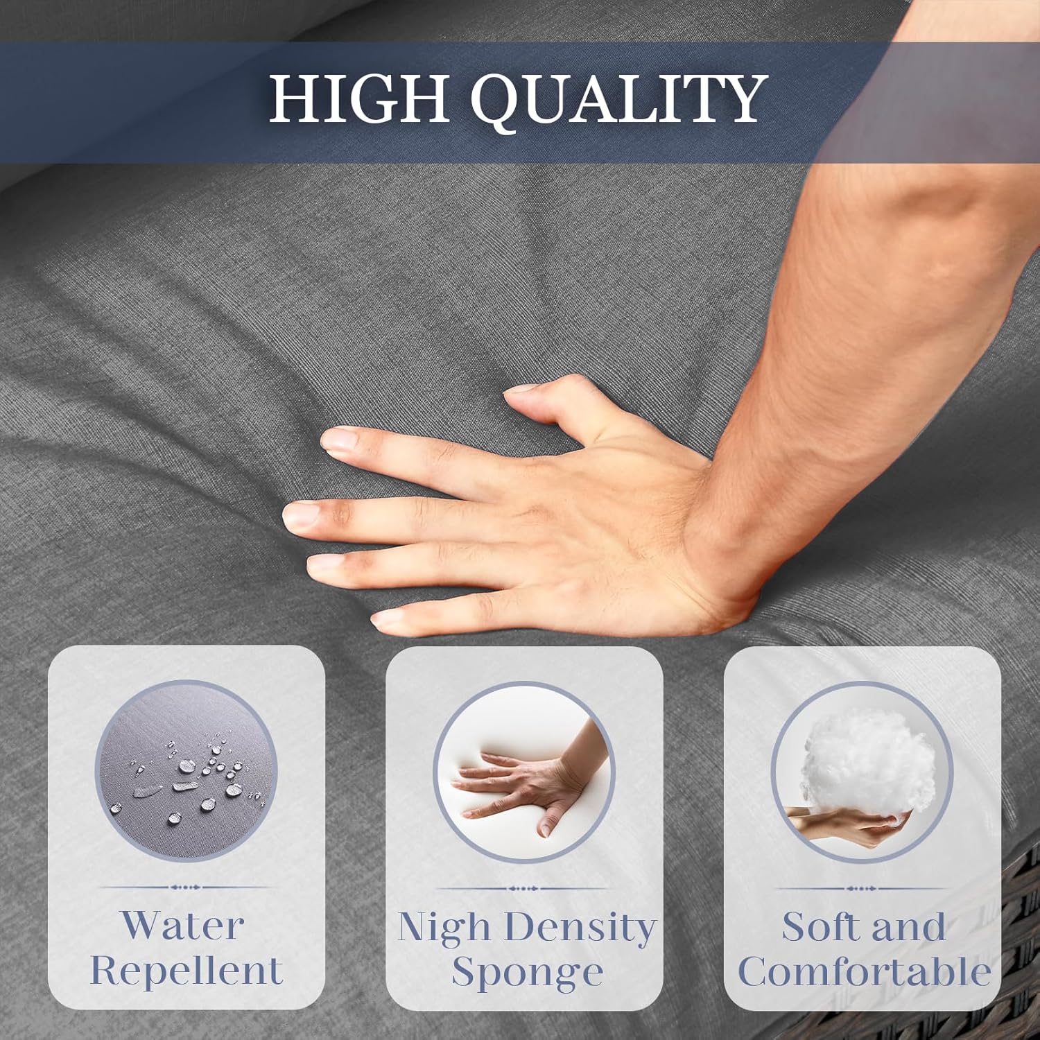 - Thick Cushions for Lasting Comfort and Support: These 4-inch thick cushions are filled with high-density resilient sponge, providing excellent support and long-lasting comfort. The wide seating design ensures plenty of space to relax, while the cushions retain their shape and bounce back after each use, never compressing. Perfect for outdoor lounging, these cushions offer both softness and durability, giving you a superior seating experience for years to come.