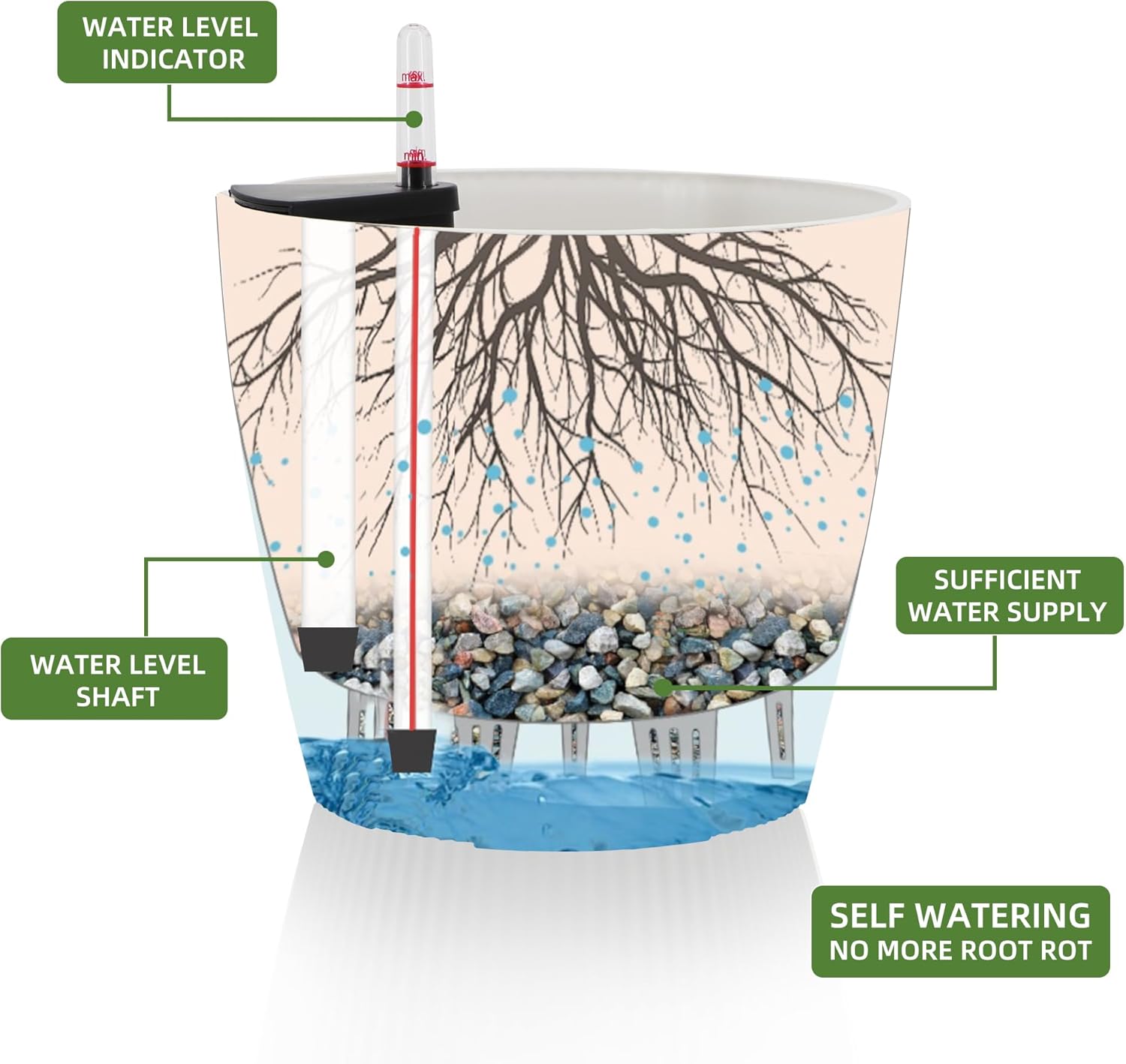 - NEVER MISS WATERING AGAIN - The reservoir between the inner mat and outer pot keeps the water ready, then watering time is at your discretion on the gauge. The design of drainage plug and spillway hole is to avoid cycles of overwatering and underwatering. The sufficient water supply system enables double the water-efficient than conventional pots. Don't be anxious about missing watering while you enjoy a long term holiday on a journey or travel outside