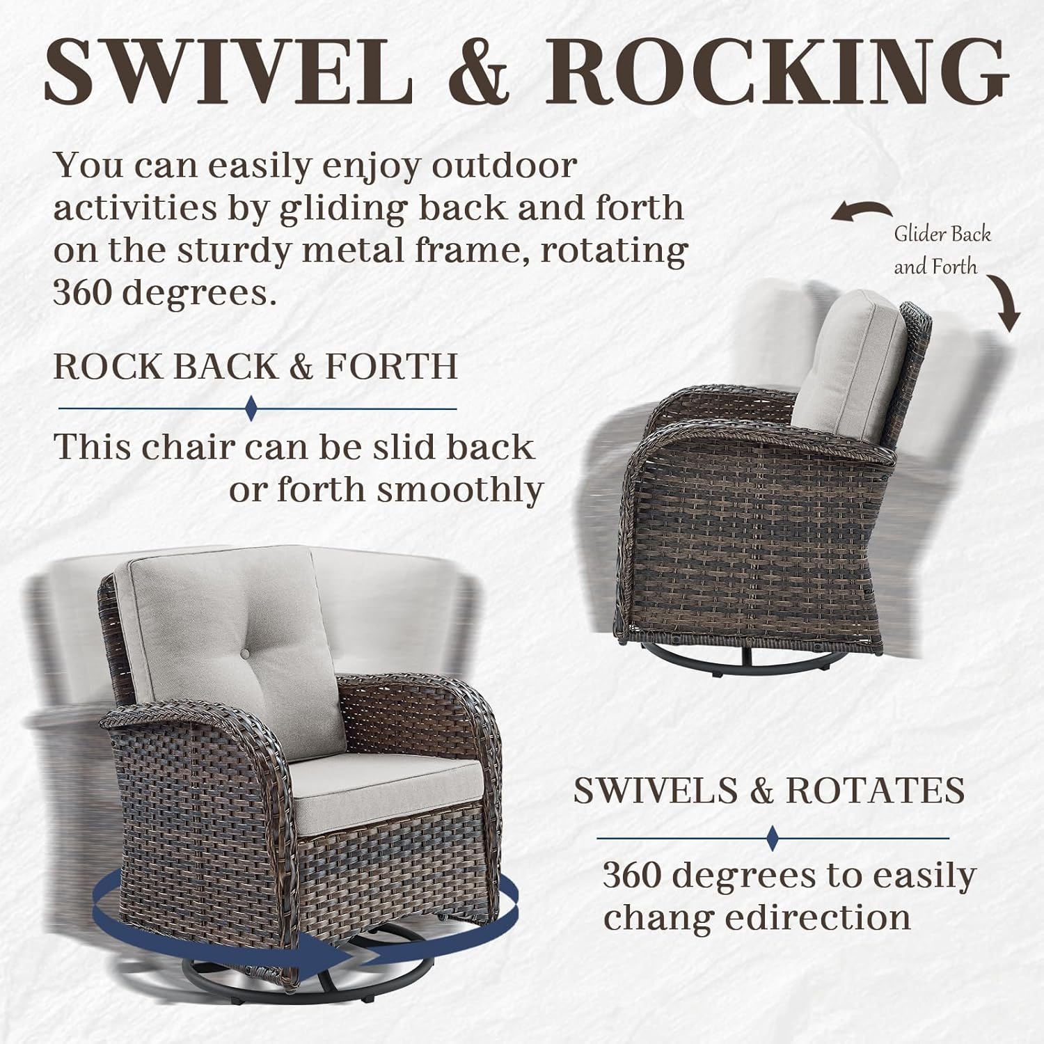 - Swivel Rocking Chairs:Resting on chairs with sturdy round metal base allows to glide gently and swivel 360Β° for relaxing, with seat and back cushions contribute to comfortable support, making the outdoor set a perfect addition to transform your patio.