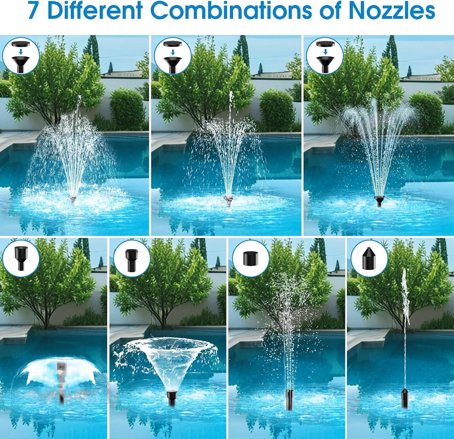 - ⛲【Variety of Water Styles】The solar fountain pump equipped 7 different nozzles, which can adjust the water flow, spray height and jet shape by change the nozzles to meet your needs. Moreover, the solar pond pump with intimate design allow rotate the control valve of the pump to adjust the water lift level and flow rate.