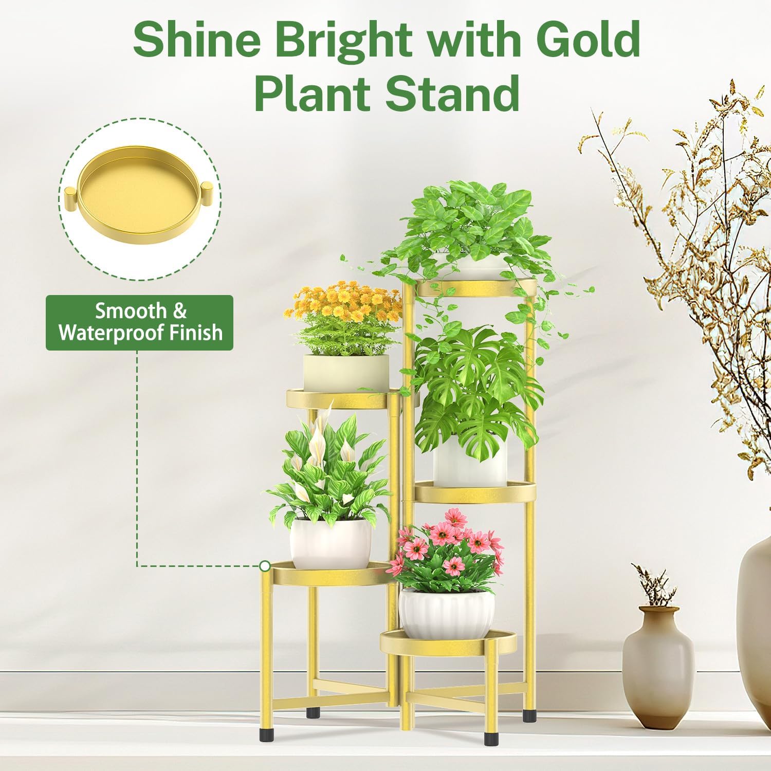 iDavosic.ly Plant Stand Indoor Outdoor, 5 Tier Corner Metal Flower Display Holder Shelf, Folding Tall Orchid Rack for Patio Balcony Porch Garden Living Room House, Gold