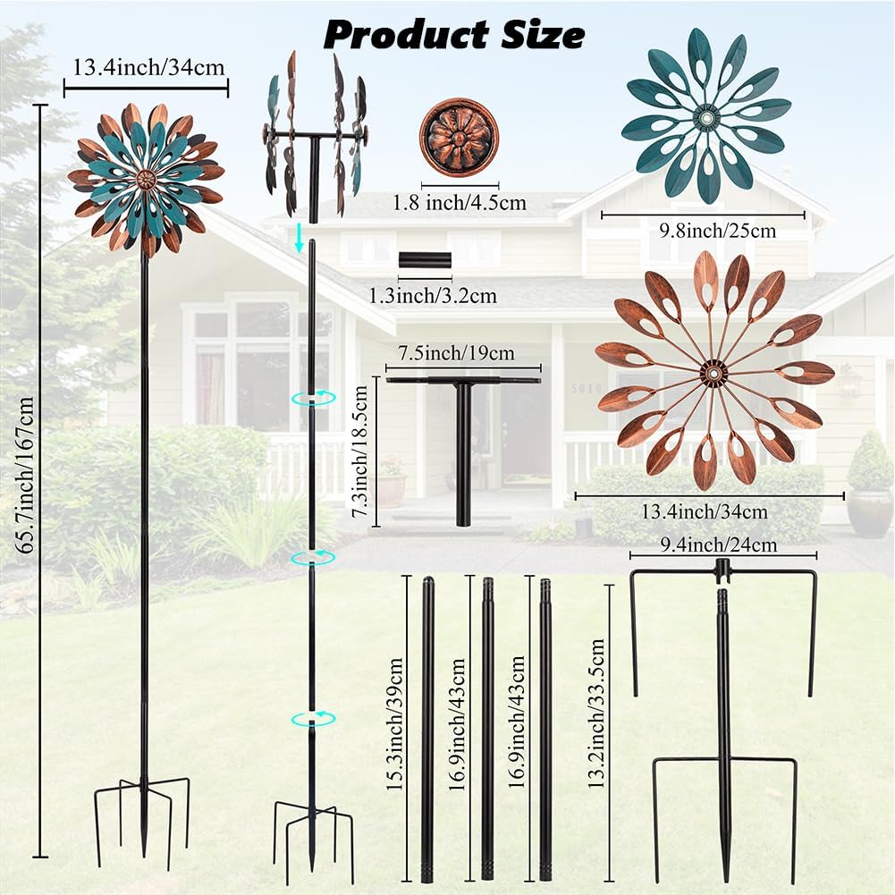 - Product Details: The spinners for yard and garden stand at 65.7 inches tall and measures 13.4 inches in width. It's made entirely of sturdy metal, and all surfaces are coated with rust-proof paint, ensuring it can withstand the elements over time