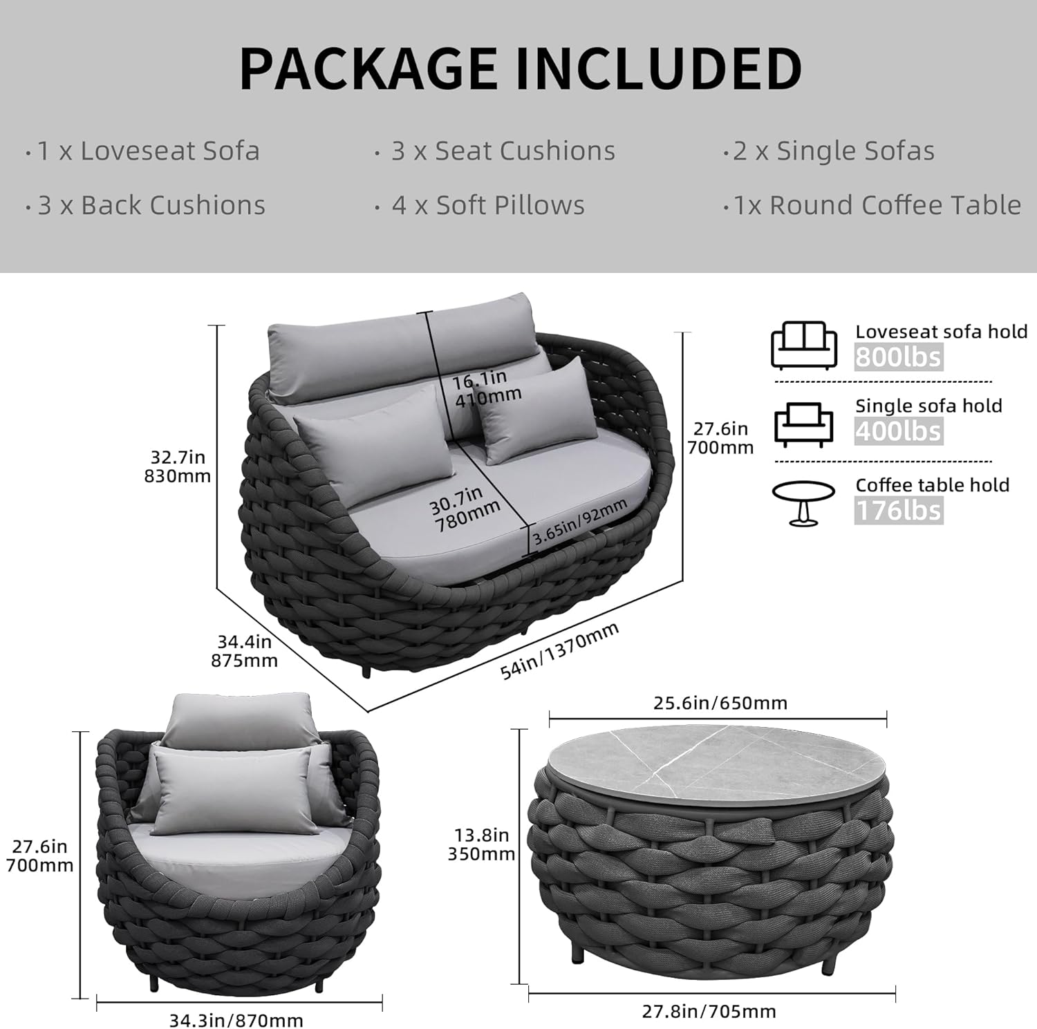 - Dimension,No Required Assembly - Single Chair: 34.3"(L) x 33"(W)x27.6 "(H);Round Table: 28"(W) x 13.8"(H).Outdoor sectional sofa can hold 400 lbs for each seating.Round coffee table can hold 176 lbs.Get your outdoor life refreshed with 6 piece aluminum patio furniture.