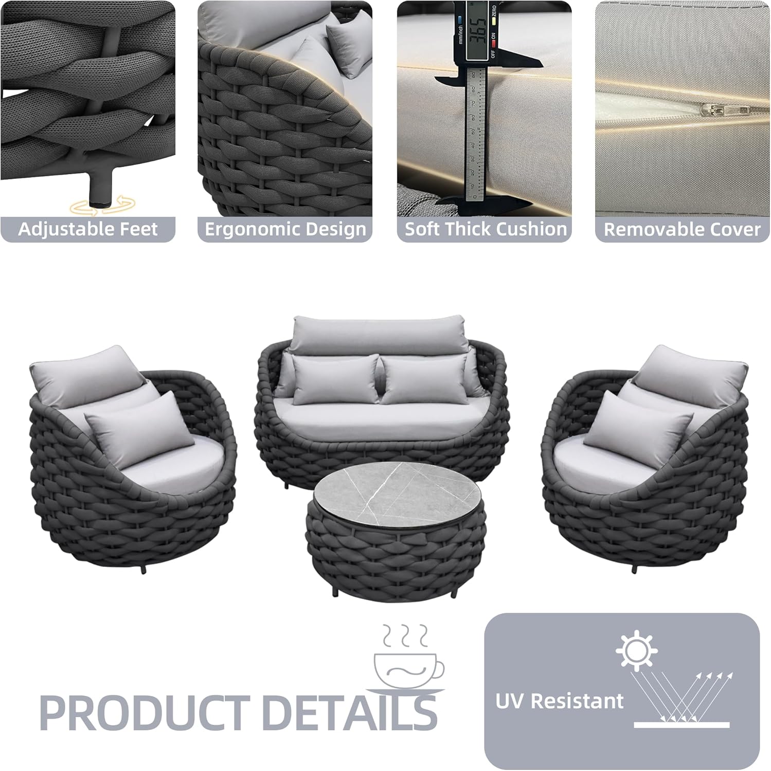 - Soft & Comfortable: Outdoor patio furniture has 3.8" thick seat cushions that are upholstered by water-resistant and UV-protective polyester fabric for ergonomic optimal comfort.Cover of cushions can be removeable and washable by invisible zipper as well
