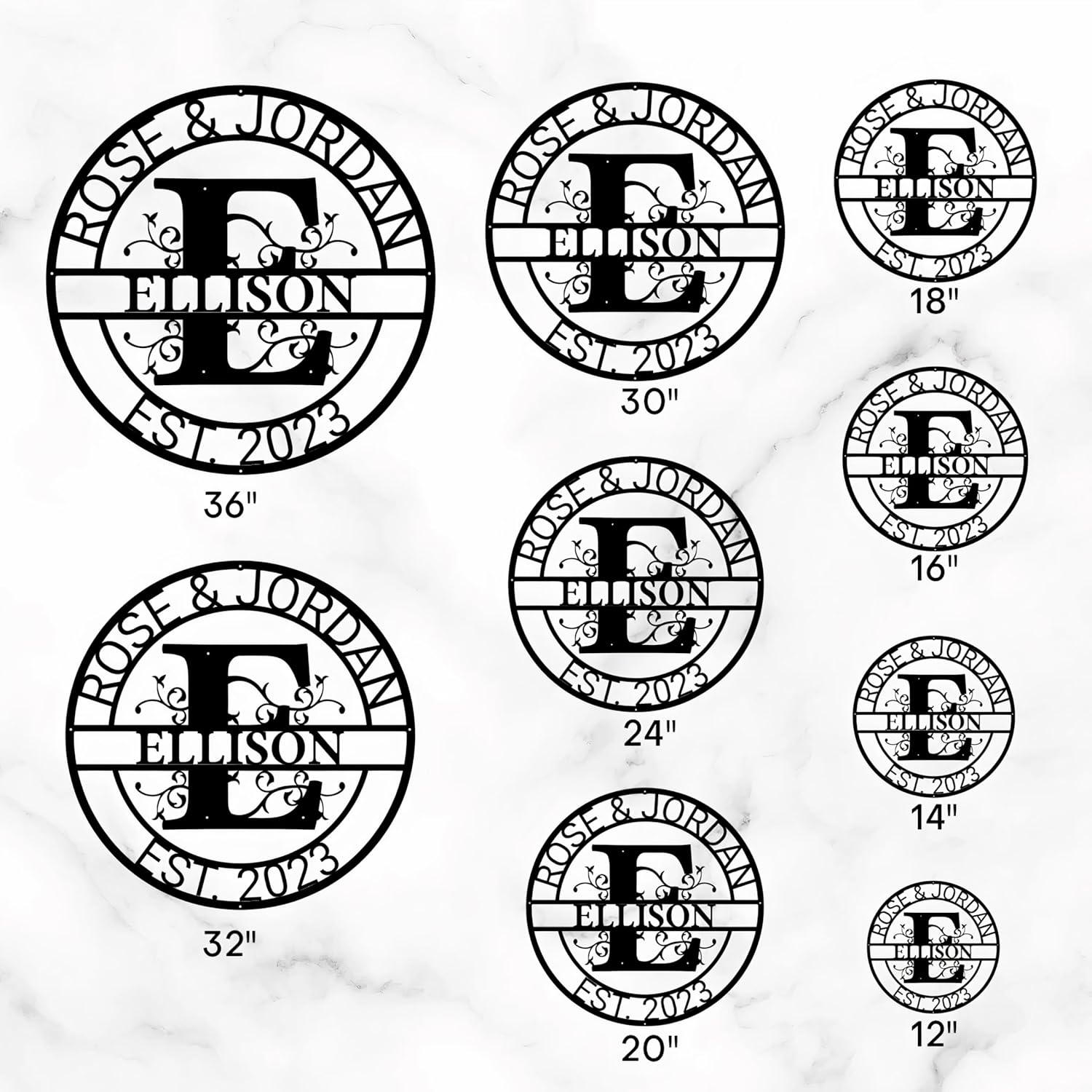 - Various Size & Color Options : Our custom monogram name wall sign is available in a range of sizes to suit your space, including 10", 12", 14", 16", 18", 20", 24", 27", 32", and 39". Choose from an array of stunning color finishes like Black, White, Gold, Red, Blue, Bronze, Copper Hammertone and Silver Hammertone, allowing you to create a design that perfectly matches your decor style.
