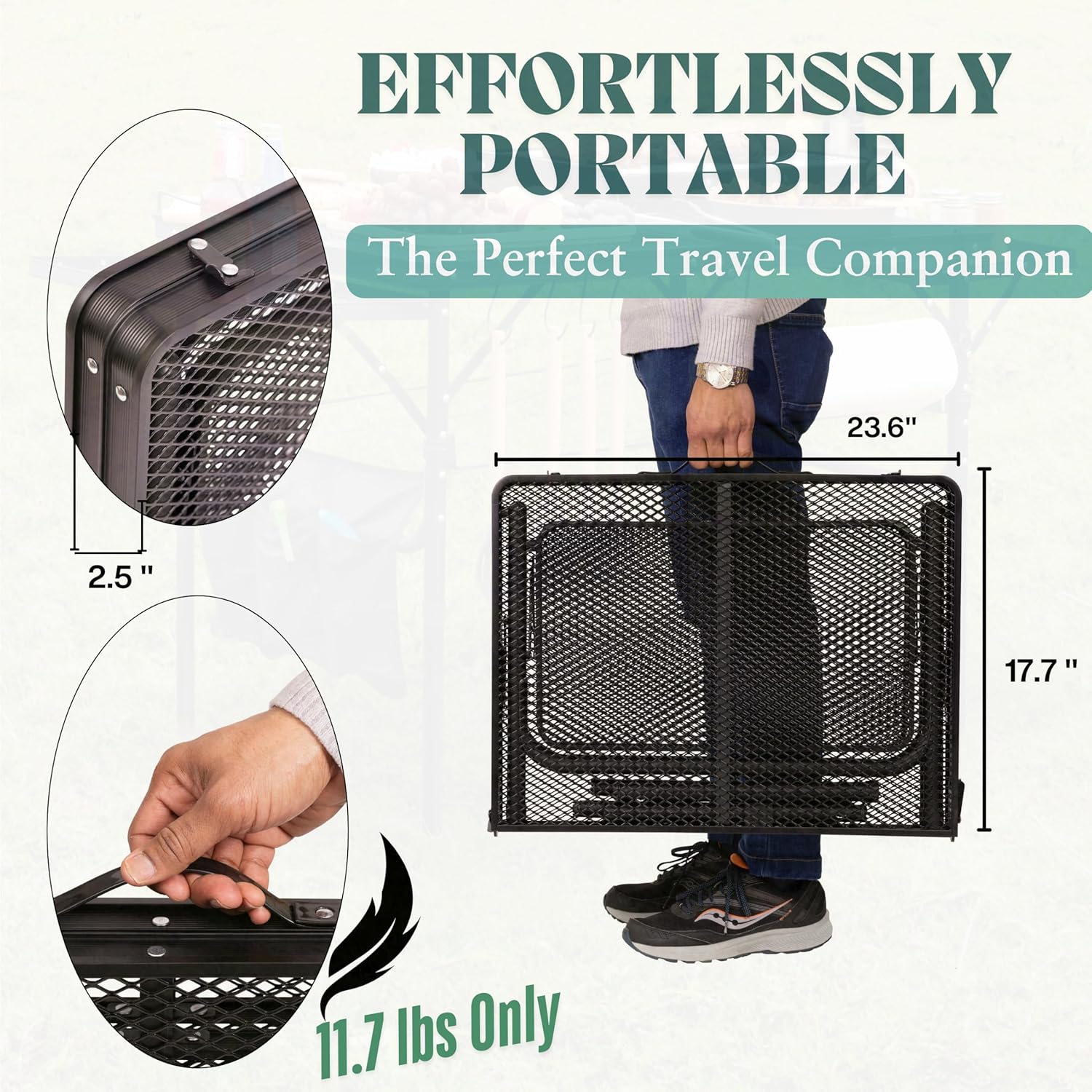 - β Extra Storage Features: A Protective Cover Carry Bag, 2 wing panels, a Unique paper towel holder, a garbage holder, a mesh net with side pockets and utensil hooks for ample, organised storage. Its adjustable table design efficiently clears space and reduces clutter.