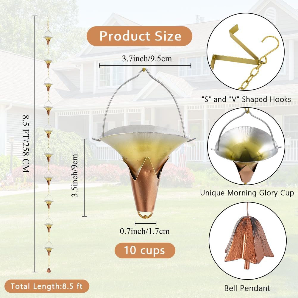 - Unique Design: The metal rain chain is composed of 10 exquisite handmade morning glory shaped cups. The rain water chain can effectively guide the rainwater, bringing a different visual effect and decorate the eaves.Can be used as an optional alternative to the traditional rain gutter system