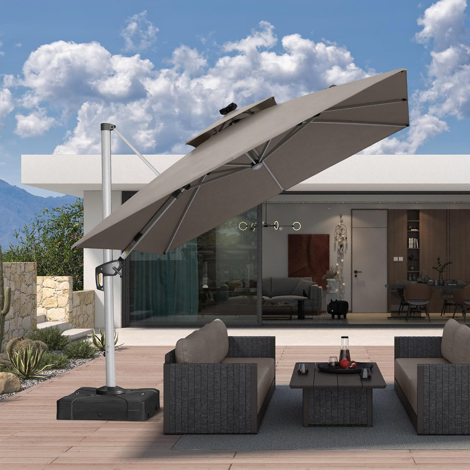 PURPLE LEAF 10' X 10' Solar Powered LED Patio Large Umbrella Offset Double Top Hanging Umbrella Outdoor Market Umbrella for Garden, Heather Taupe