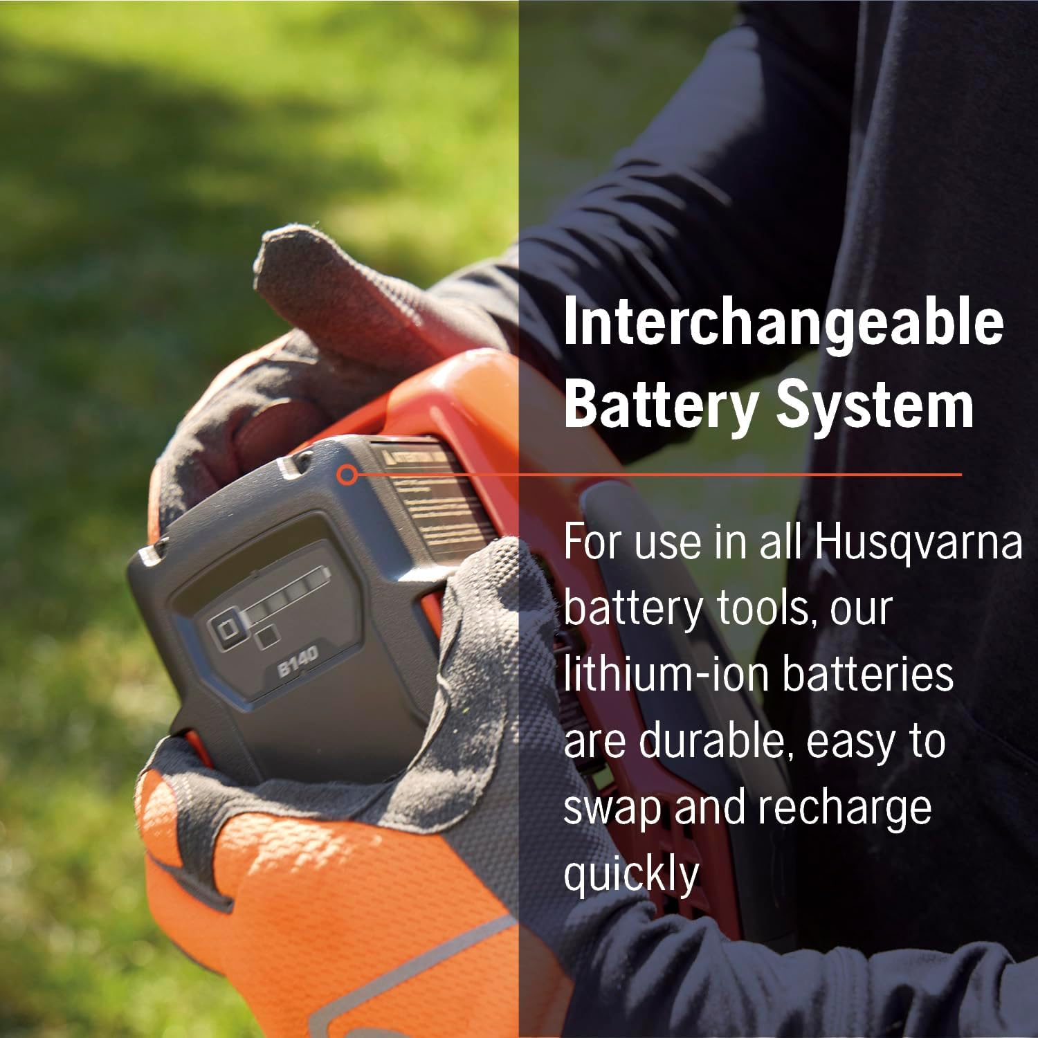 - INTERCHANGEABLE BATTERY SYSTEM: Able to be used in all Husqvarna battery tools, our lithium-ion batteries are durable, easy to swap and recharge quickly