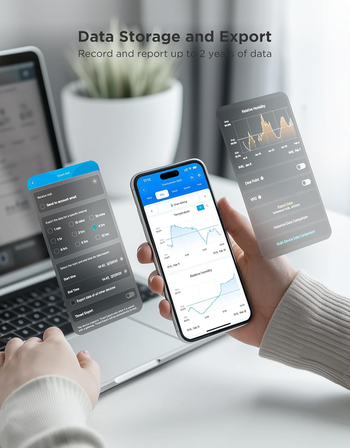 - Data Storage & Export: This humidity monitor uploads data to the app via WiFi and Bluetooth. View the temperature and humidity trend chart from the past 20 days and export data from the past 2 years. Ideal for greenhouses, farms, etc.