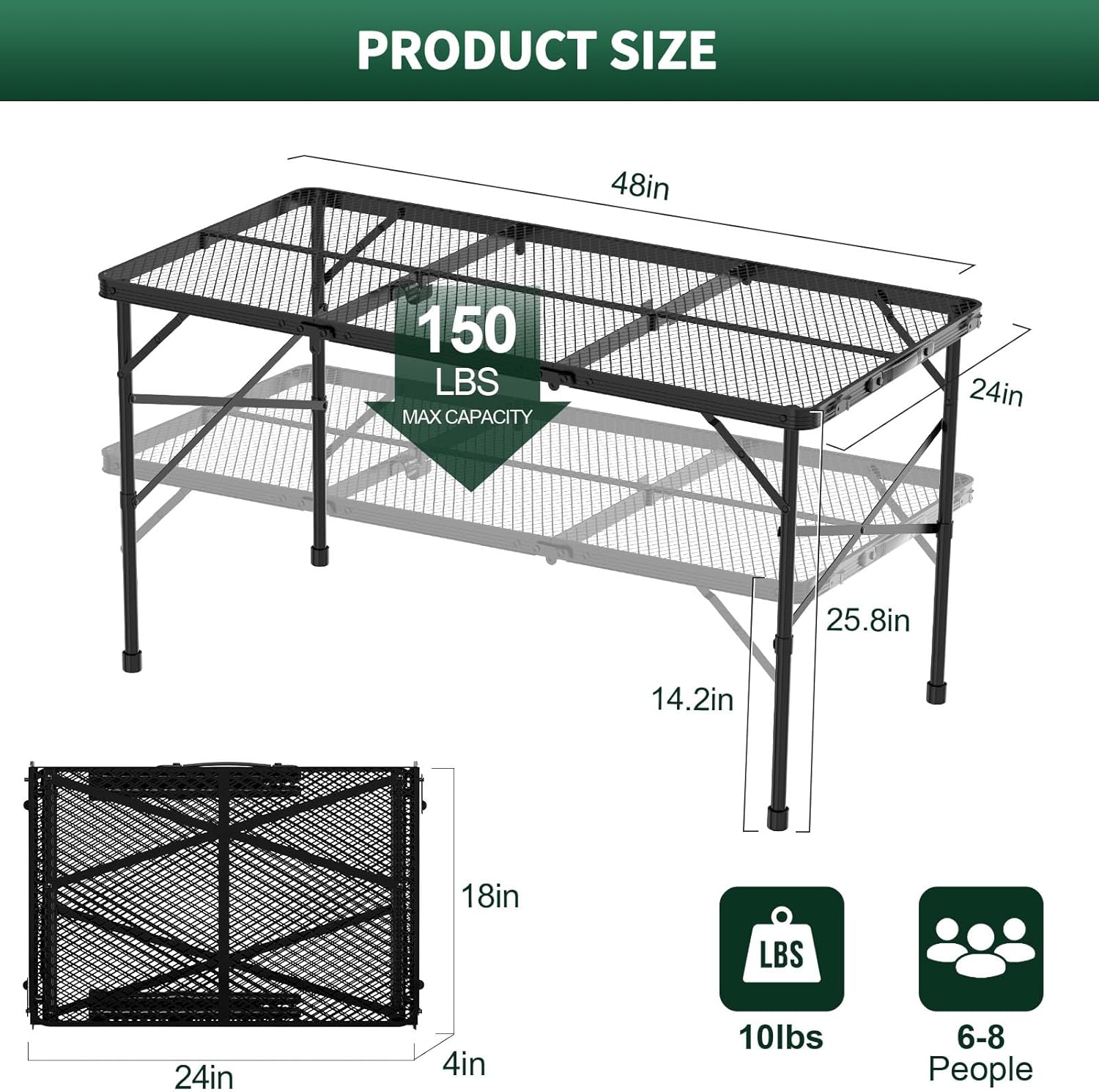 - Without Tool Assembly: Experience easy assembly with our metal folding camp table. Simply unfold and you're ready to enjoy outdoor activities in seconds, no tools required.The folded size are 24"L x 18"W x 4"H and the weight only 10 lbs.