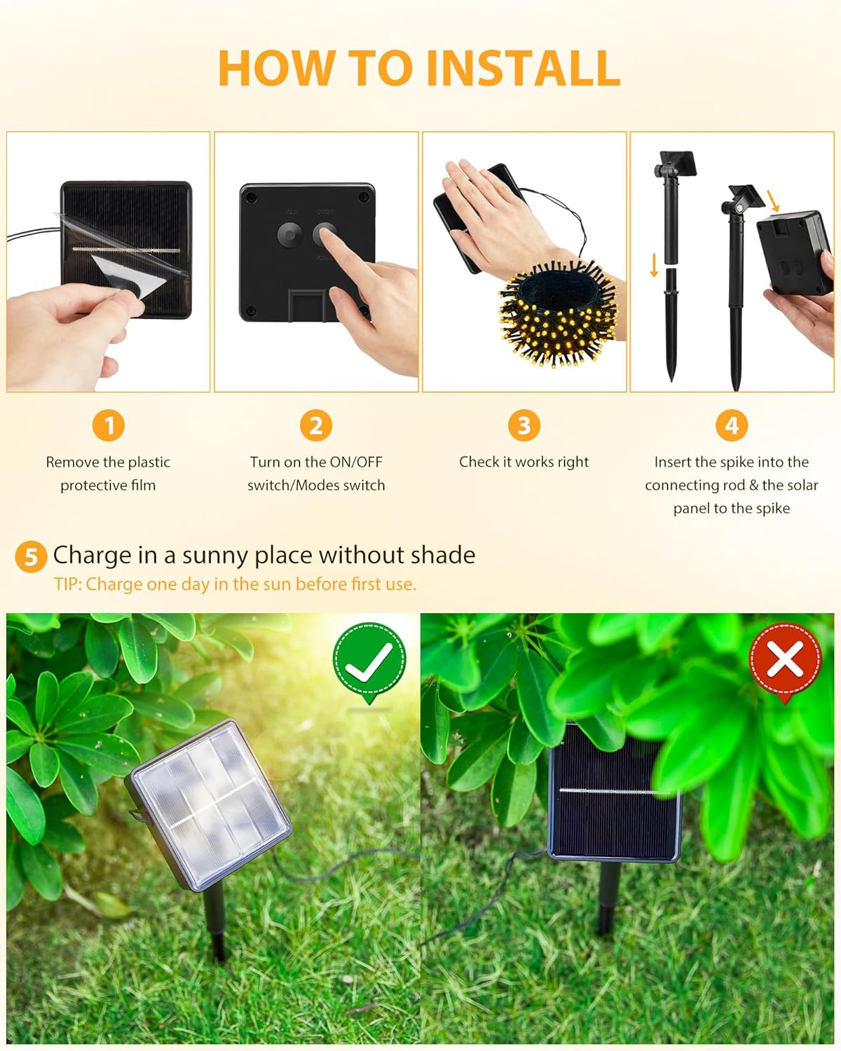 - ăAuto On/Off & Easy InstallationăSolar outdoor lights fully charged under direct sunlight for 4-6 hours, they can work up to 8-10 hours at night, the outdoor solar lights automatically turn on at dusk and auto off at dawn. Also, solar christmas string lights with ground stake is easy to install, just stake into the ground, and our string lights have soft light cords, very suitable for DIY any shape.