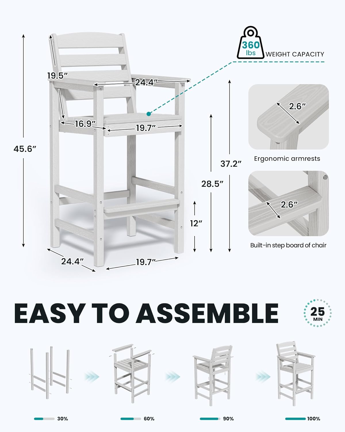 - Easy to Assemble - With clear instructions and necessary hardware provided, every balcony adirondack chair hase 8 parts, only need 5 steps according to the manual included, and you will get a Tall Adirondack Chair (Installation tools included).