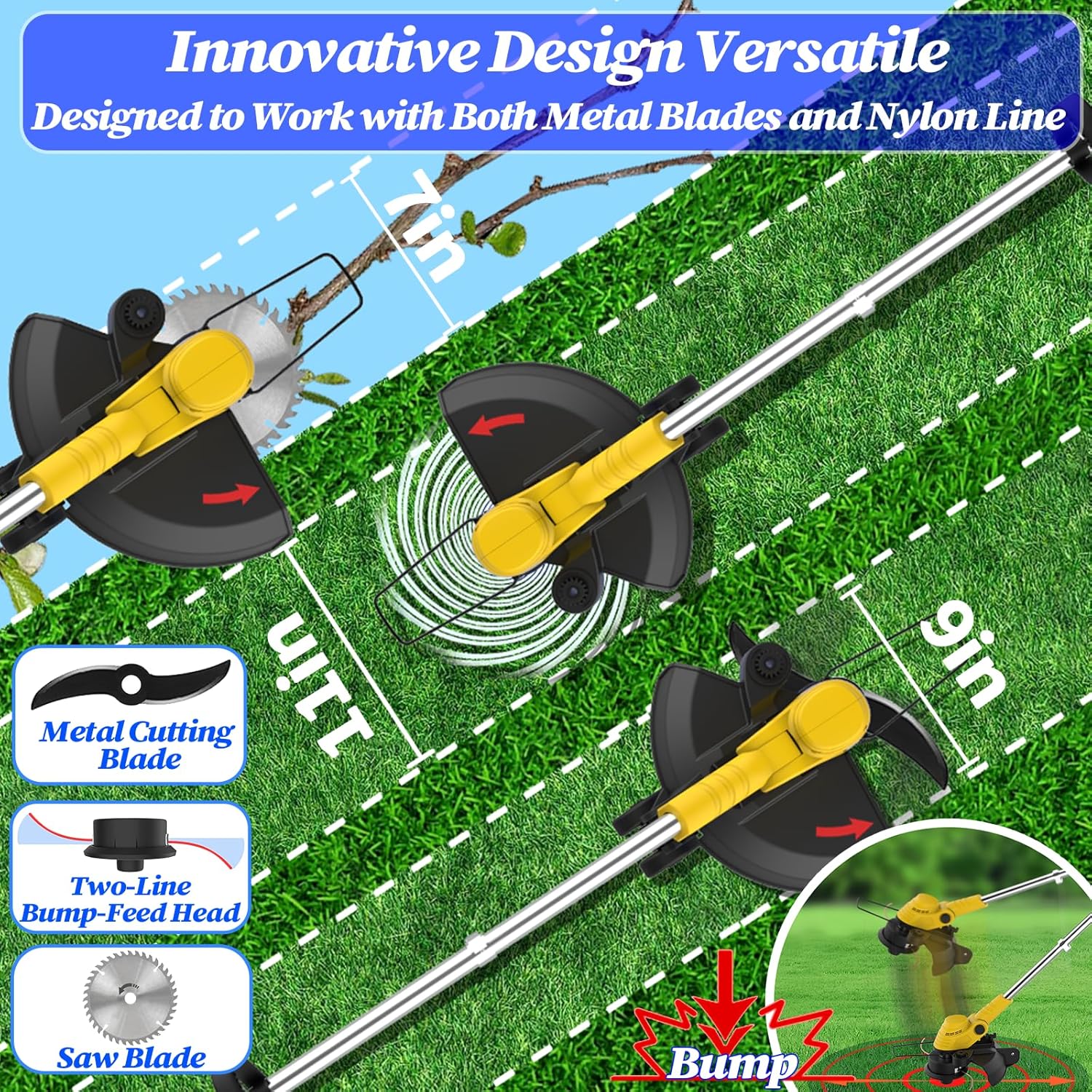 - 【All-In-One Compatibility: Metal Blade, Dual-Line Bump-Feed】 0.095″ dual-line head (11″ width) cuts fine grass with ease. 9″ metal blade effortlessly handles overgrown vegetation.