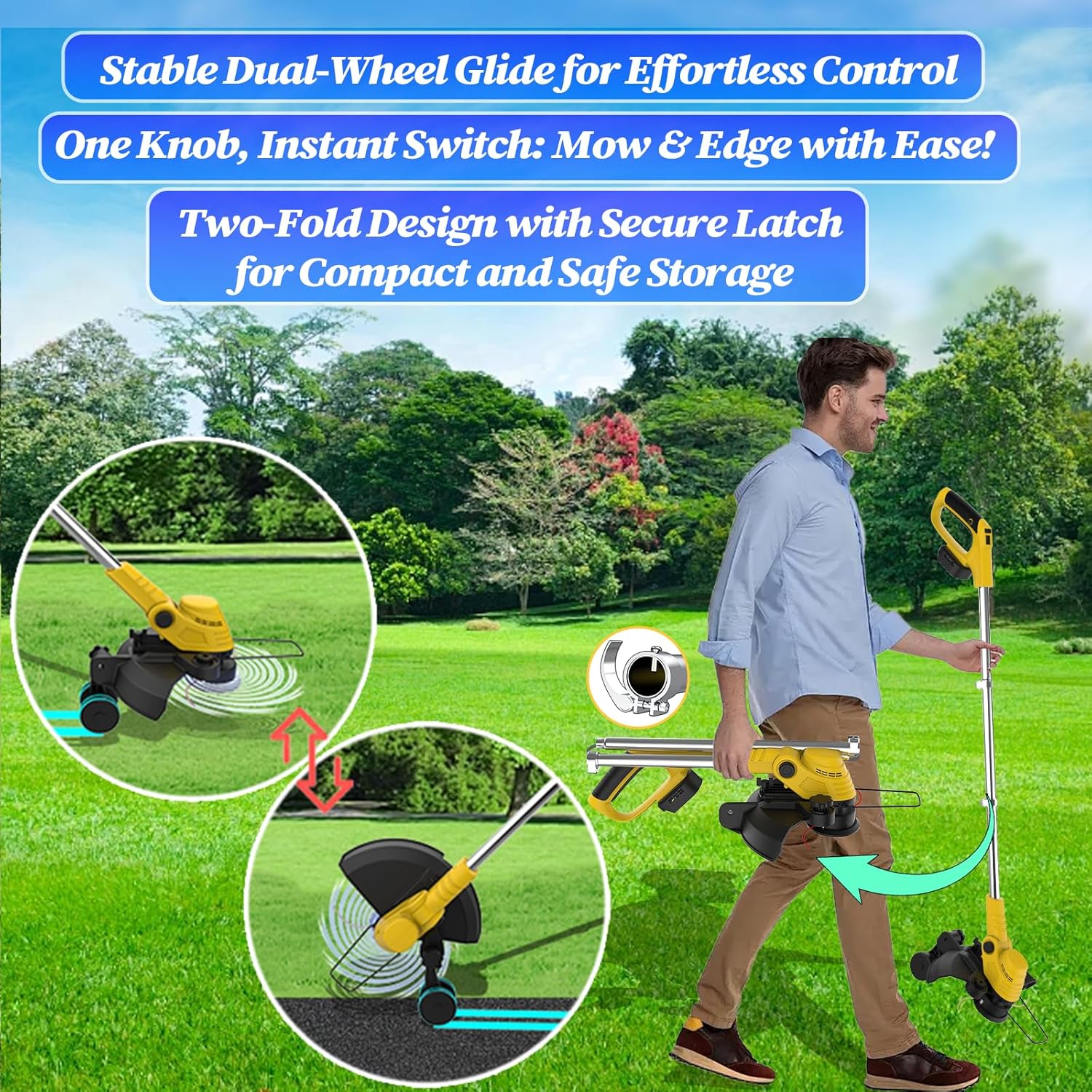 - 【Ergonomic Wheel-Edger & Mini Mower】 Effortlessly switch between edging and mowing by attaching the wheels. Hand-tightened bolt allows a tool-free mode change. Designed for swift assembly—no screwdriver required.