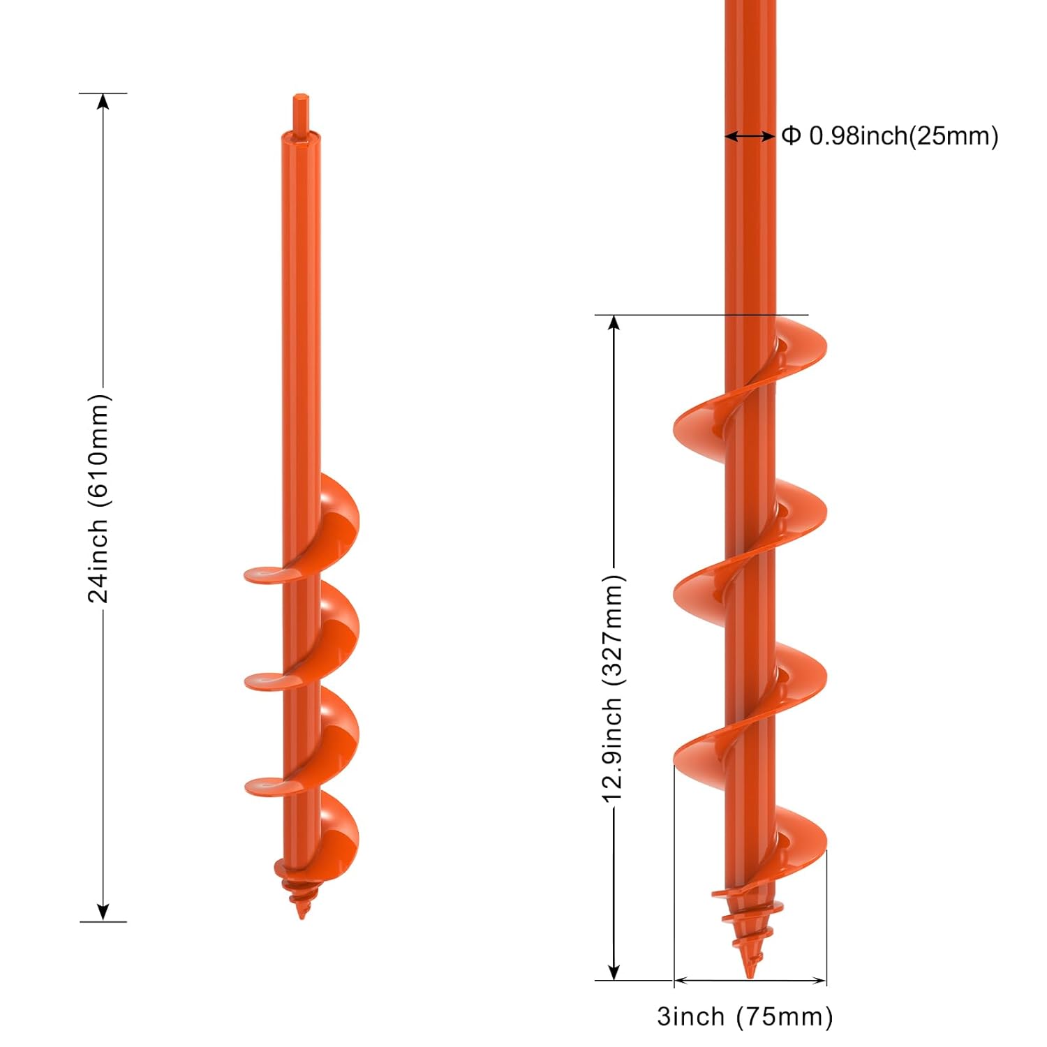 - π«ππππππππ: The total length of garden auger =24'', solid steel diameter=0.98'', blade width=3'', blade thick=3mm, spiral length=12.9'', fits 3/8β drill chuck.