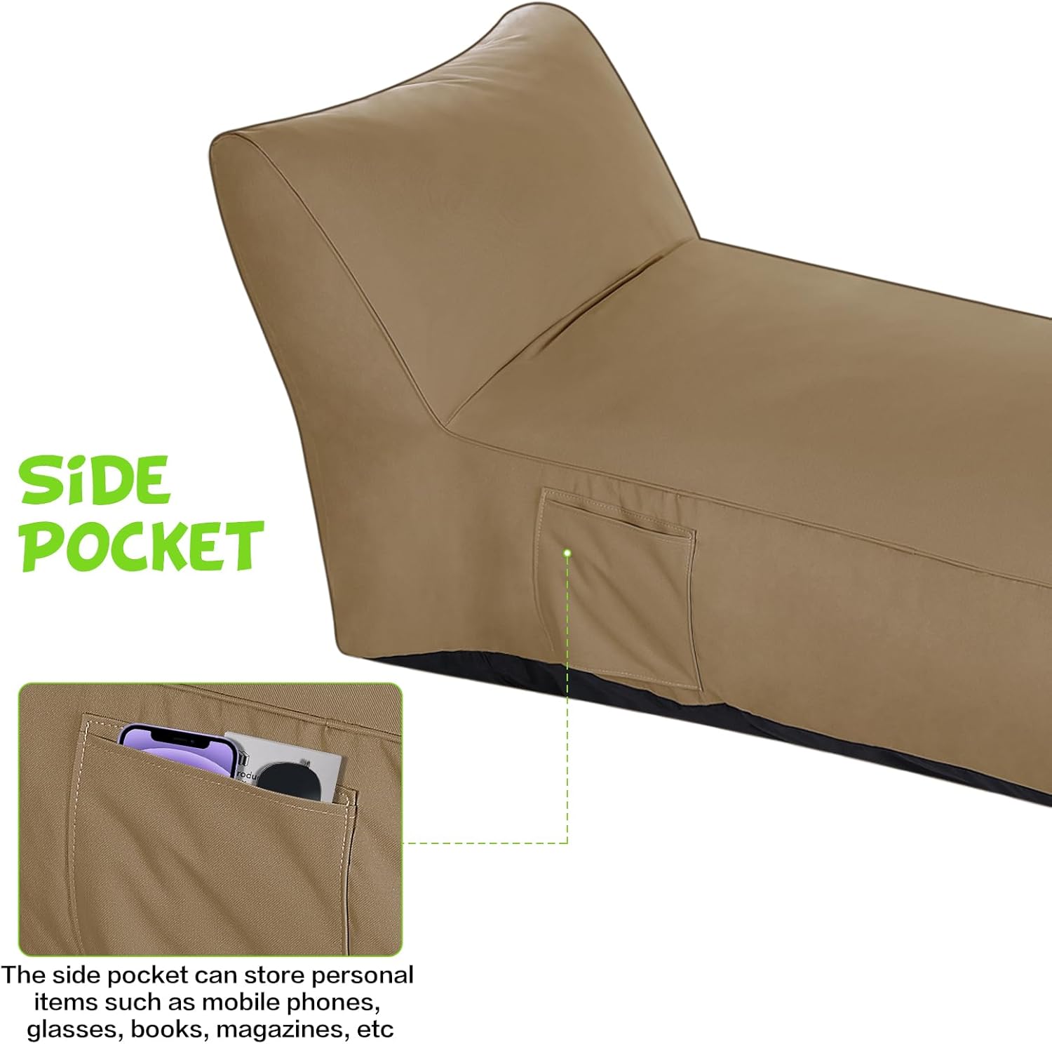 - Stylish Design: With side pockets that can store personal items such as mobile phones, glasses, books, magazines, etc. With a sleek and modern aesthetic, this chaise lounge chair complements any outdoor living space. The compact structure and beautiful texture seamlessly blend into and highlight your patio, poolside, balcony, deck, backyard, garden, beach, or lawn.