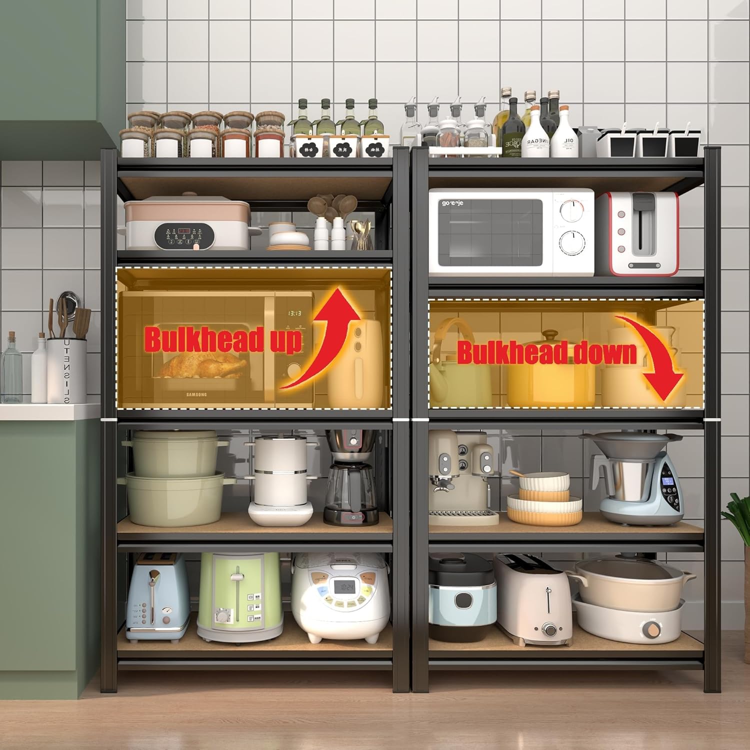 - ă Fully Adjustable & Customizable Storageă With 5 adjustable tiers, you can easily modify the shelf heights to fit items of all sizesâfrom tall kitchen appliances to small storage bins. The tool-free assembly allows quick setup, while the reinforced steel frame ensures a secure, wobble-free fit in any environment.