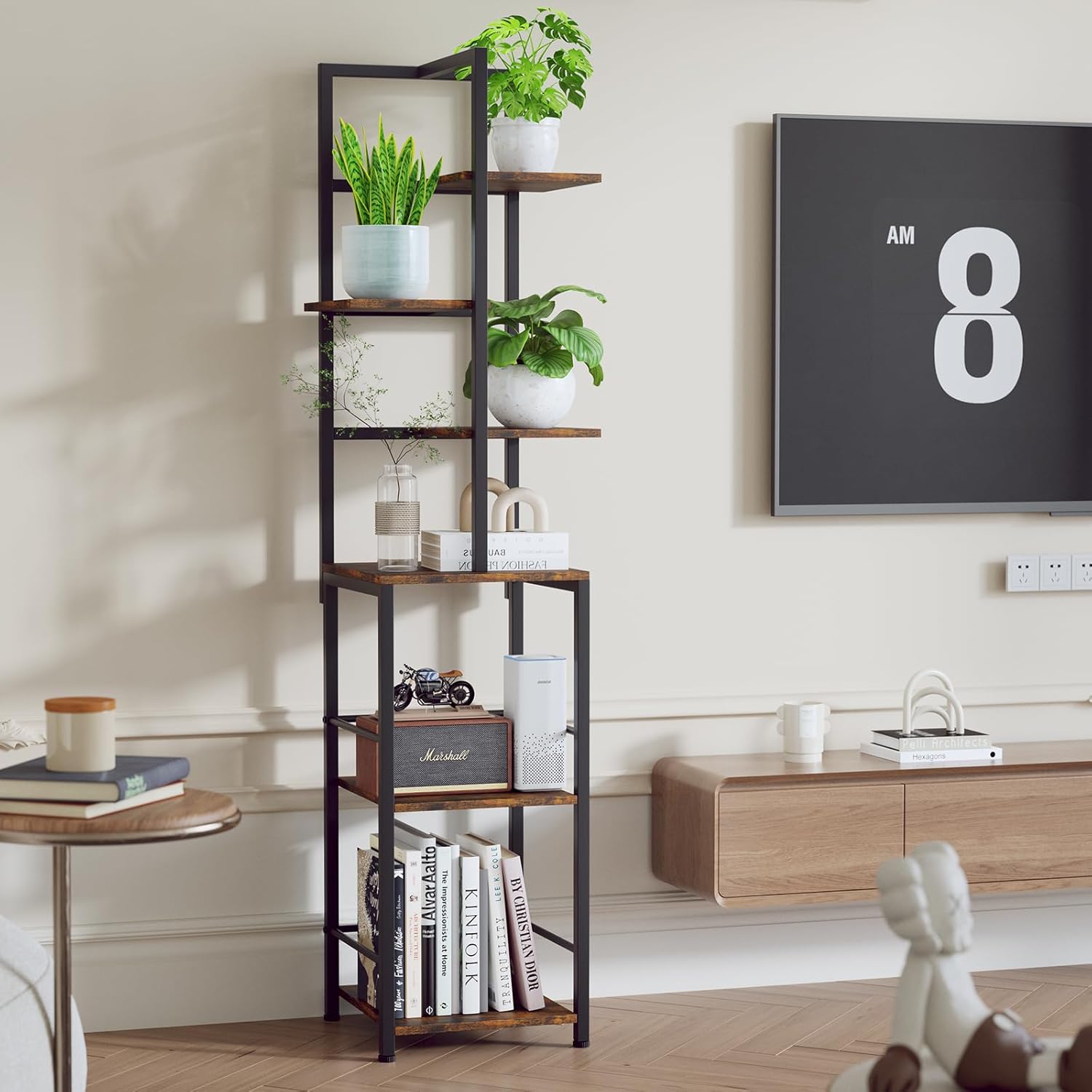 Plant Stand Indoor with Grow Light, 6-Tiered Tall Plant Stand Indoor, Metal Plant Shelf with Bookshelf Bookcase and Adjustable Light, Ideal for Living Room, Reading room, Garden, Patio (Brown)