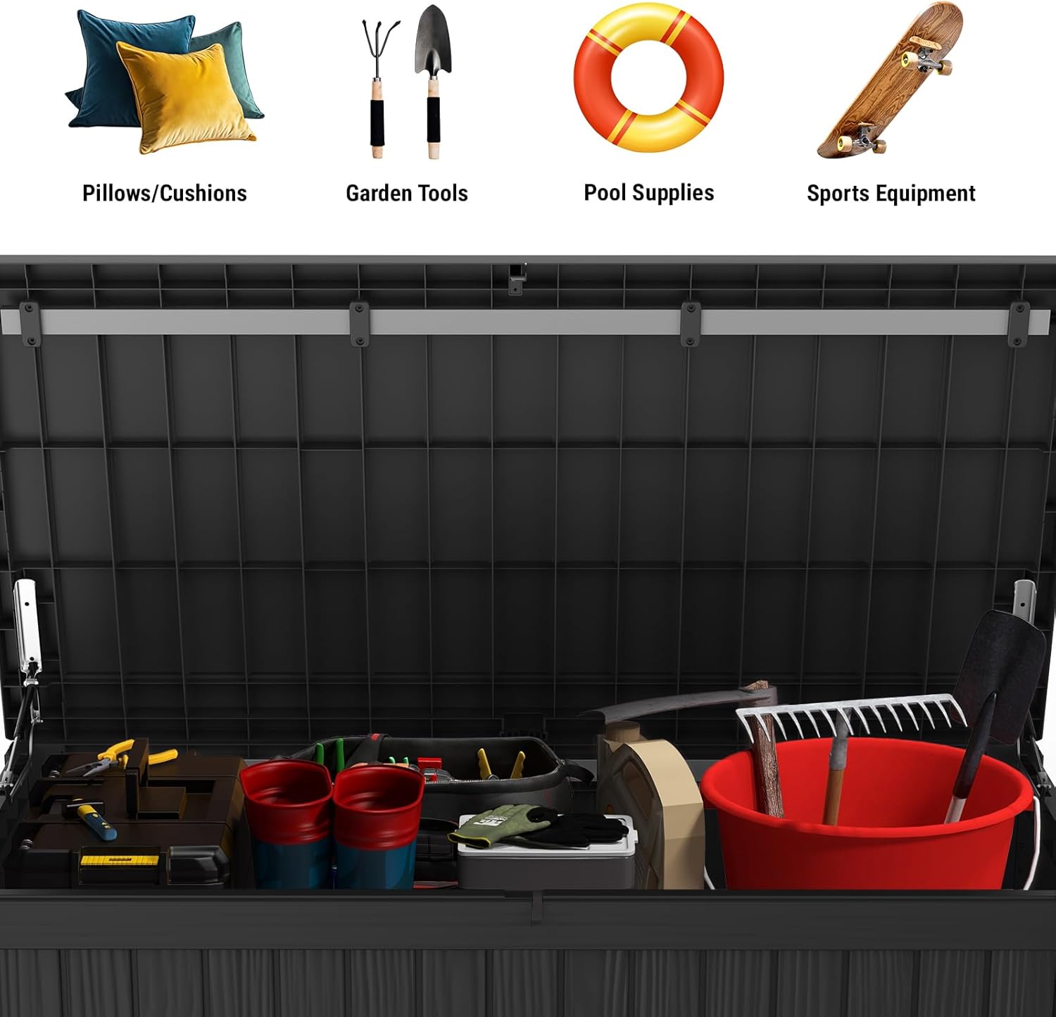 - 【Smooth & Secure Design】- Equipped with dual hydraulic hinges, the lid opens smoothly and stays securely in place for hassle-free access to your items, the slow-close mechanism ensuring safety for your families, lockable lid (lock not included) provides added security for your outdoor essentials