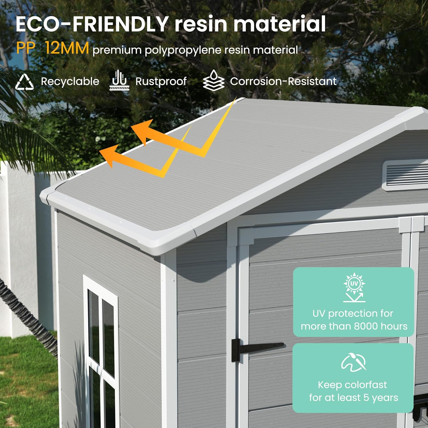 - RESIN MATERIAL: Our storage shed is crafted with 12MM premium polypropylene resin plastic, which is recyclable and eco-friendly. Resin shed is corrosion-resistant, waterproof, rustproof and with UV protection for more than 8000 hours, less bending and puncturing, worry-free for use in all weather conditions. It can be used daily for five years without fading