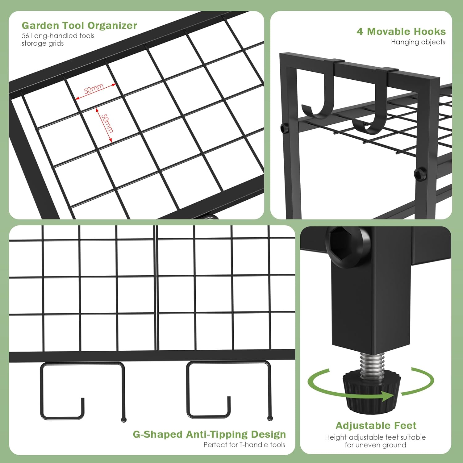 - Garden Tool Rack: Designed as a lawn tool organizer for the garage, our garden tool holder offers a total of 56 tool slots within a compact size. The unique storage holes are crafted to accommodate various kinds and sizes of tools, making it perfect for gardening and lawn maintenance tools, as well as cleaning equipment