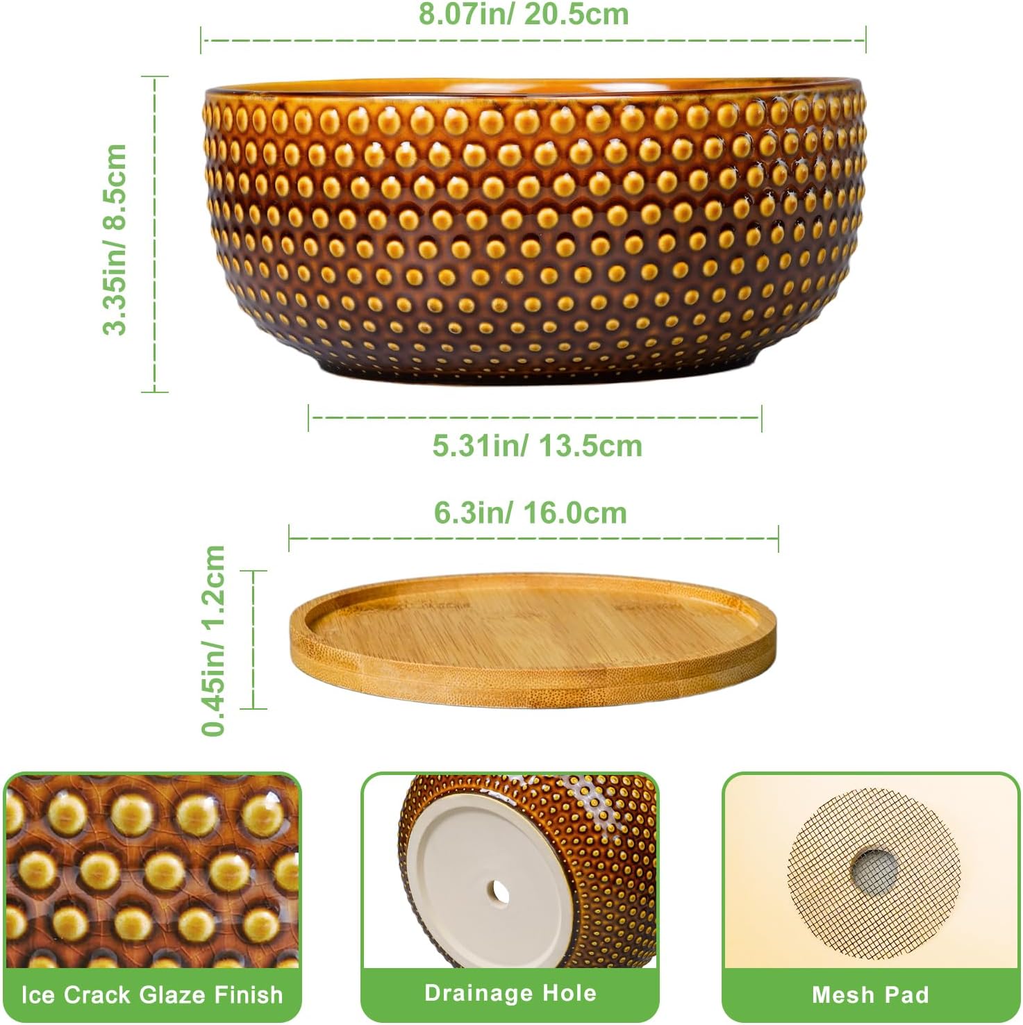 Bonsai Pots - 8 Inch Succulent Bowl for Indoor Plant, Shallow Round Ceramic Planters with Drainage Hole and Saucer, Boho Home Room Office Apartment Decor, Plant Lovers Gifts, Brown