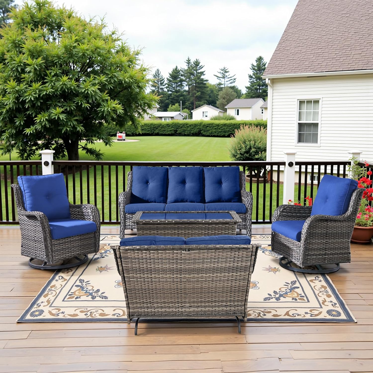 - 5-Piece Outdoor Patio Furniture Set β This patio furniture set includes a loveseat glider, two swivel rocker chairs, a sofa, and a multifunctional coffee table with storage for the Belord ottoman. Perfect for patios, porches, and backyards, it combines relaxation and style for any outdoor setting.