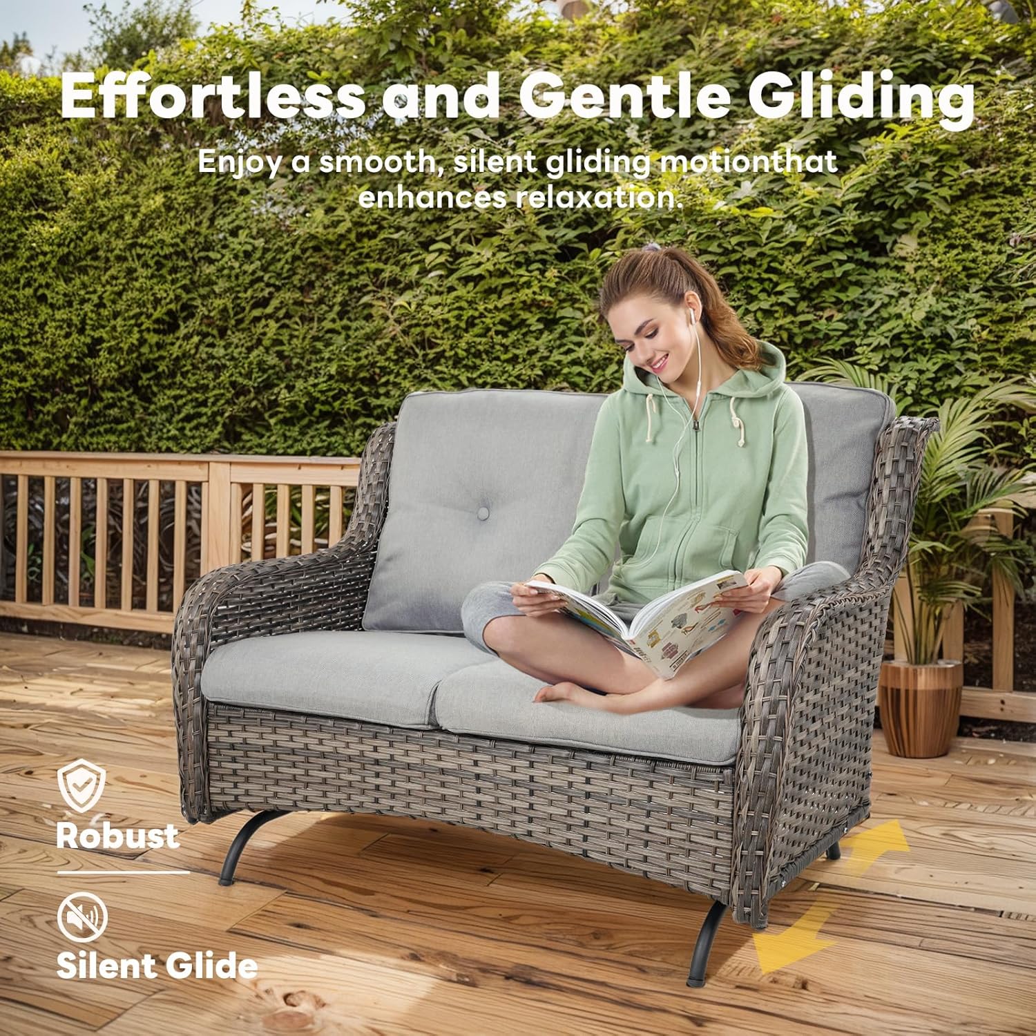 - 4. Comfortable Deep Seating with Plush Cushions: The loveseat glider chair and swivel glider chairs come with 4-inch thick, sponge-padded cushions that provide excellent support and comfort. The high backrest and wide armrests enhance relaxation, while the olefin fabric is water-repellent, easy to clean, and fade-resistant for long-term use.