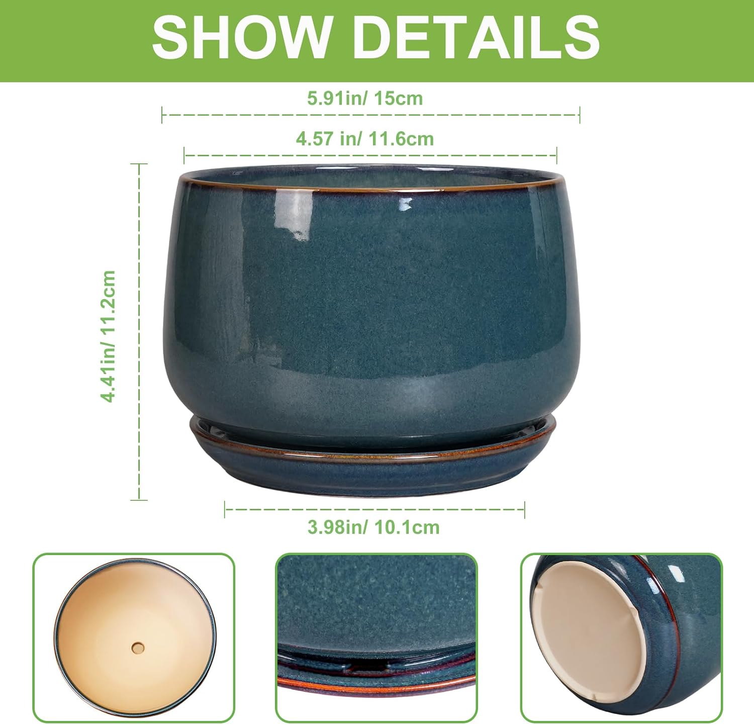 - Dimensions: This ceramic plant pot pit measures 5.91" x 5.91" x 4.41". This blue flower pot is an ideal choice for growing succulent plants, cacti, aloe vera, orchids, snake plant, african violet and other indoor & outdoor plants