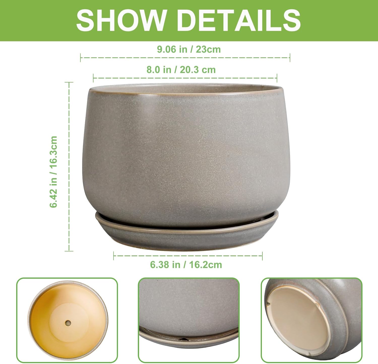 G EPGardening Ceramic Planter 9 Inch - Round Modern Plant Pots with Drainage and Plant Saucer Indoor Outdoor for Flower, Vanity Decor, House Gifts, Retro Grey