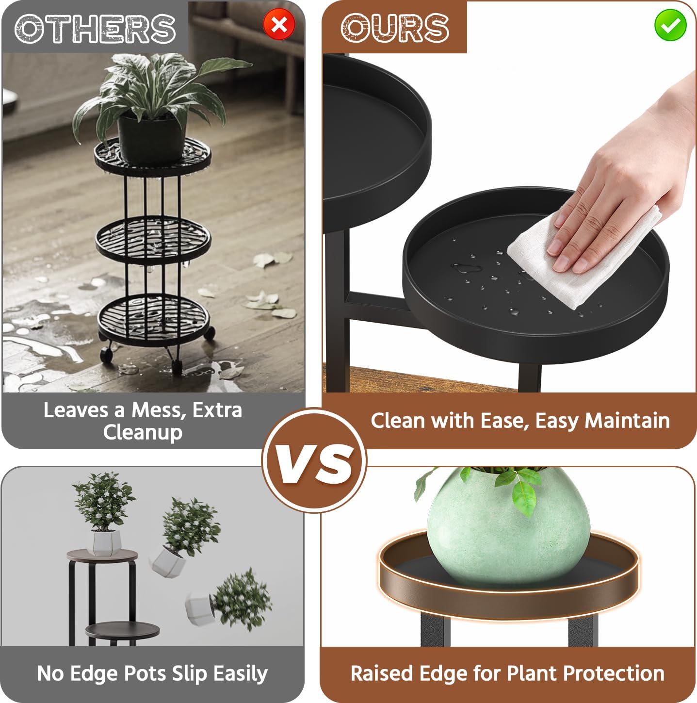 - 【 Keep Floors Dry with Edge Trays】Say goodbye to water stains on your floor! The 3 tier plant stand come with edge trays that catch any overflow, keeping your plants safe and your floor nice and dry. No more worrying about water damage when caring for your indoor plants!